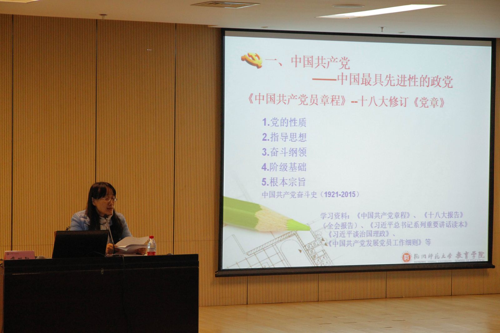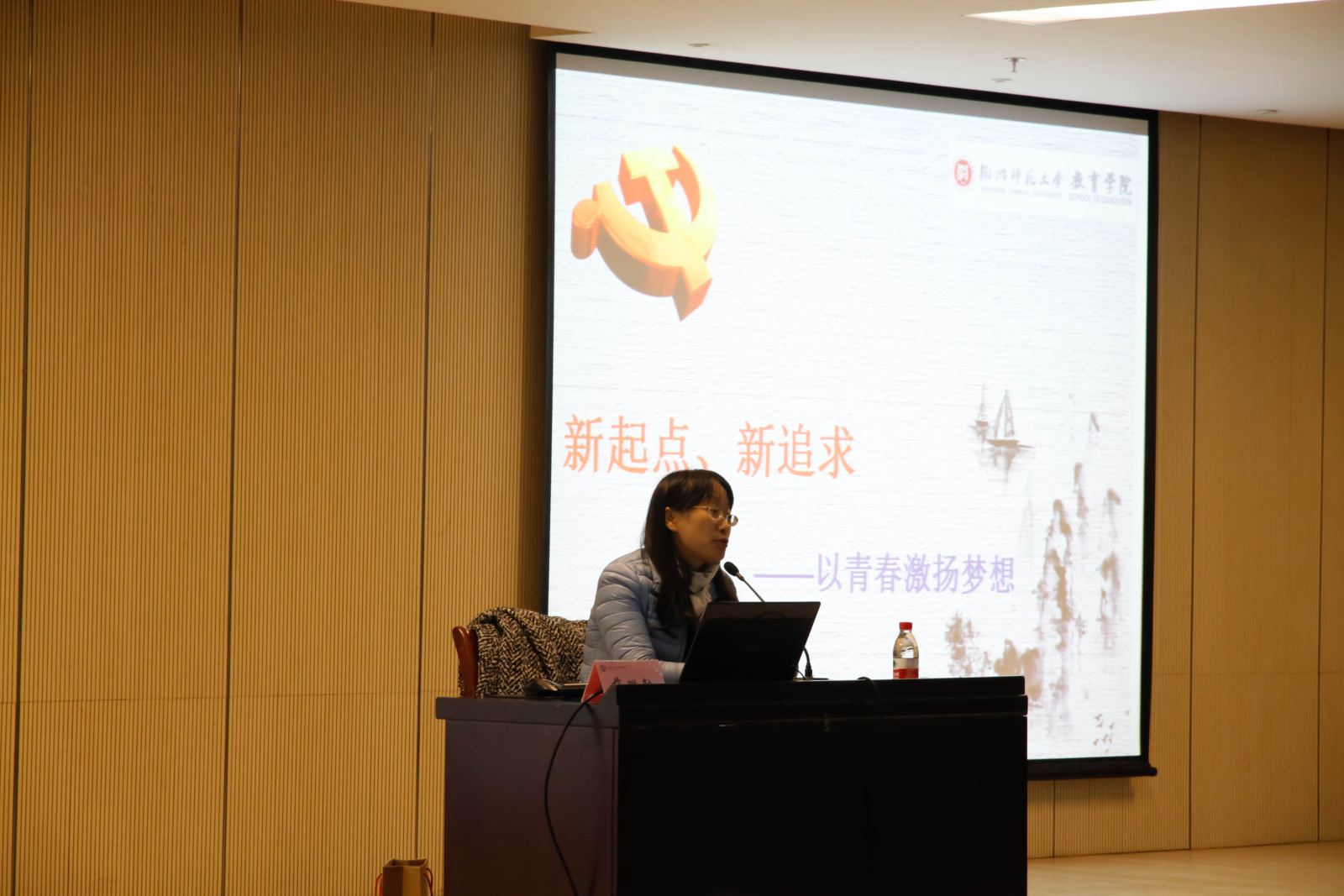 11月25日下午,杭州师范大学教育学院15级新生第一次党课在恕园2-112圆满举行。教育学院党委副书记蒋璐敏为学院2015级本科新生进行了“新起点,新追求——以青春激扬梦想”的主题授课。