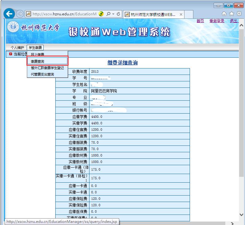 登录//xscw.tianyingbf.com后,点击菜单栏中“学生缴费”—“缴费查询”,选择查询学年可以查询每年的应缴和已缴明细。负数为应退费。