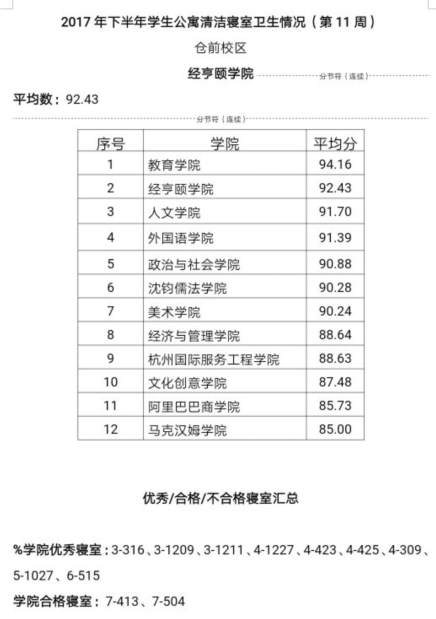 学校文明寝室检查结果—第十一周(2017.11.13-11.17)
