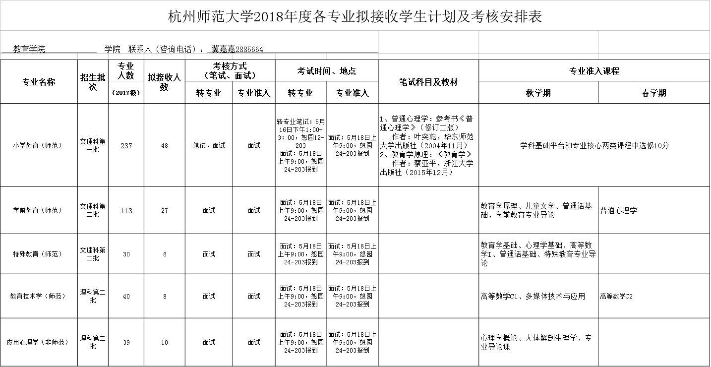 杭州师范大学2018年度各专业拟接收学生计划及考核安排表