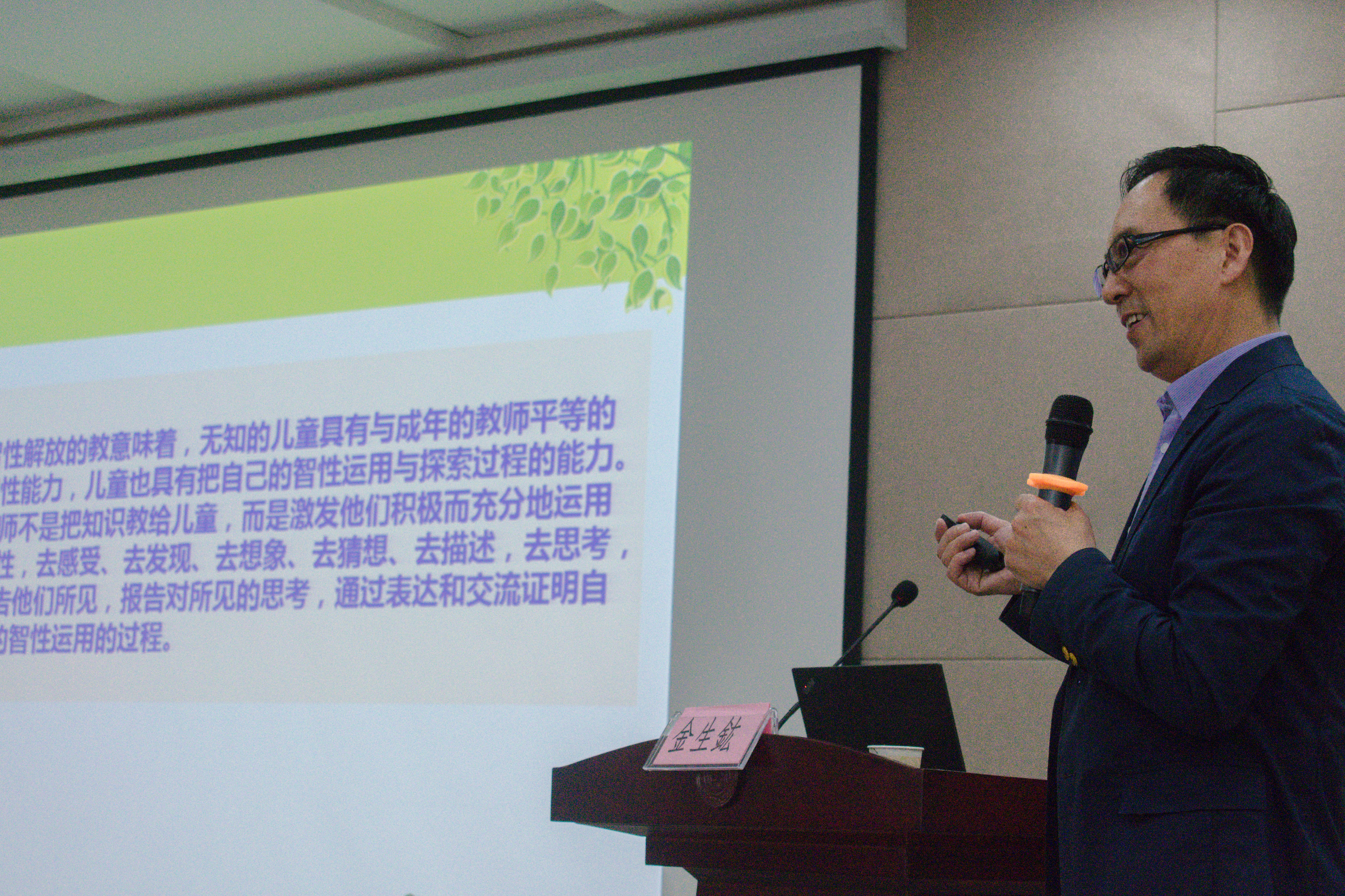 金生鈜教授则就“无知之教中的智性解放”作了讲解。通过抛出“教师可以是一个无知者?”“他可以教他并不懂的东西吗?”两个问题,金教授运用解释学的理解诠释了法国哲学家朗西埃在《无知的教师》中提出的智性平等与智性解放的理念及其意义。他指出现实的教育中存在各种桎梏儿童智性的迷思与惯习,教育应当以智性解放为根本原则,摒弃这些愚化儿童的观念与方式。智性解放意味着教育对智性平等的实践,意味着对儿童理性或智性的平等力量的运用和展现。金教授认为解放的教师实施的是无知之教,教师不传授知识,只是通过思想邀请激发学生的意志,召唤学生运用自己的智性能力并在智性历险中收获大于教师的知识之教的教益。