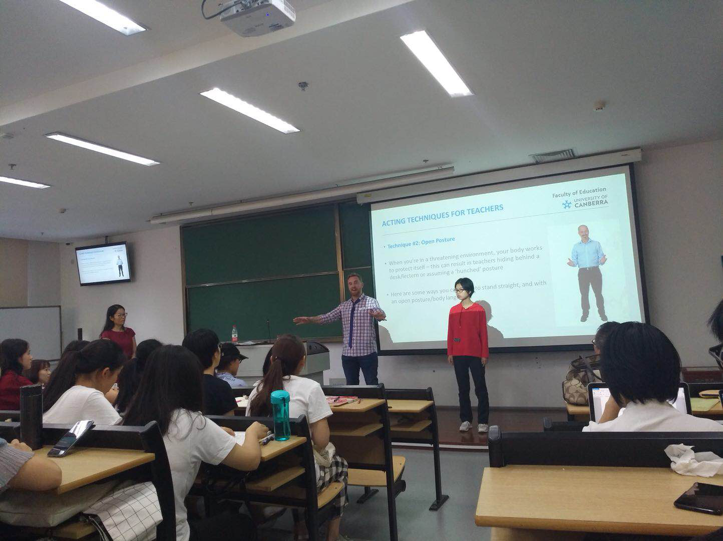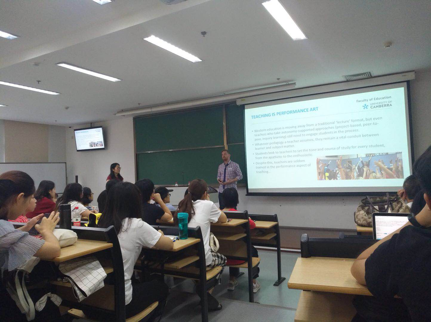 2018年09月24日上午,澳大利亚堪培拉大学教育学院中学教育系主任Duncan Driver博士做客教育学院太炎教育讲堂,在恕园13号楼201阶梯教室为天英足球即时比分 师生带来以“教师的表演技巧(Acting technique for teachers)”为主题的学术报告。讲堂由天英足球即时比分 教师许建美副教授担任主持和翻译,天英足球即时比分 200余名师生参加。