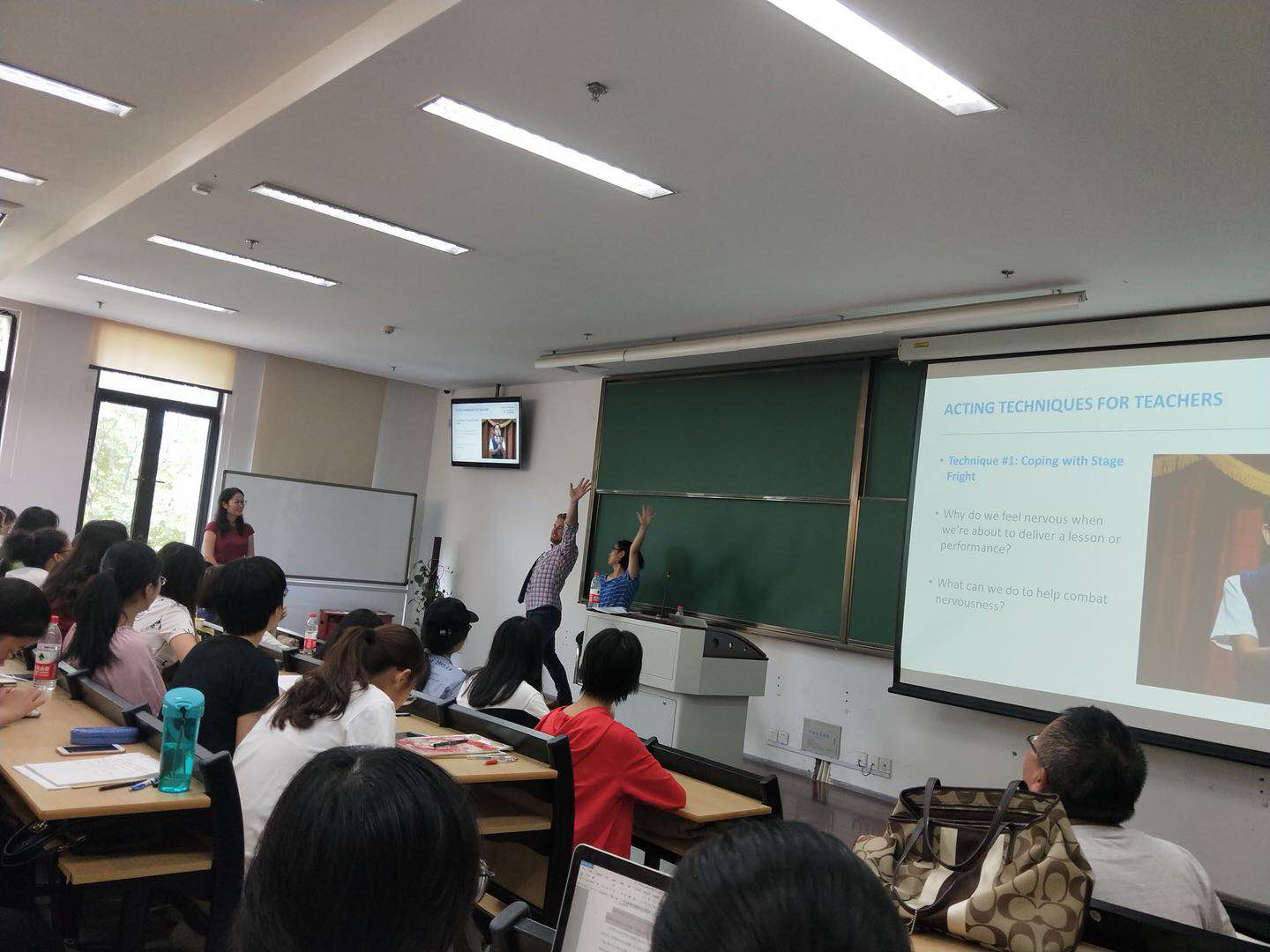 讲座伊始,Duncan Driver博士提出教学是一门表演艺术的观点。Duncan博士阐述教师的首要工作是让学生爱上所教的学科,这并不是要你在教室里挥舞着手臂、趾高气昂的巡视。随后他讲到教师有责任吸引学生学习。通过海特海追溯到之前的亚里士多德,一直到最后班杜拉的社会建构主义,都论证了学习与模仿之间存在很大关系,学生会以老师为榜样,模仿老师的行为。Duncan博士基于教学与诗学的联系,阐述了亚里士多德奠定了西方教育思想和表演思想的基础并非偶然,他引用亚里士多德的《诗学》中三种吸引和调动观众的途径来应用到教学当中。最后Duncan博士向大家提出了四点建议,来增强教师的表演技巧,首先是要克服舞台恐惧心理,找到为何恐惧的原因;第二是要采取开放式姿势或者学会肢体语言;第三你需要有意识的努力避免“紧张”活动,以有目的的活动取而代之;最后是上课的声音,从语调、语速等方面注意上课时运用的声音。Duncan博士找同学亲自示范, 用以上方法来增强上课的表演技巧。