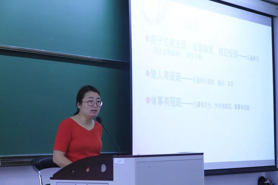 严雅芬老师首先强调了新生的安全问题,希望全体新生提高人身安全与财产安全意识。同时,她也强调了规矩意识,其中包括遵守法律法规和校纪校规,做人有规矩,做事有规矩。严雅芬老师还向各位新生介绍了大学四年的生活,希望大家能够在大一确定目标,做好规划,并好好珍惜大学的时光。她提出“学习不是唯一的,但学习是最重要”的观点,希望各位新生能守规矩,爱学习,多参加学科竞赛,做一个有规划的人。