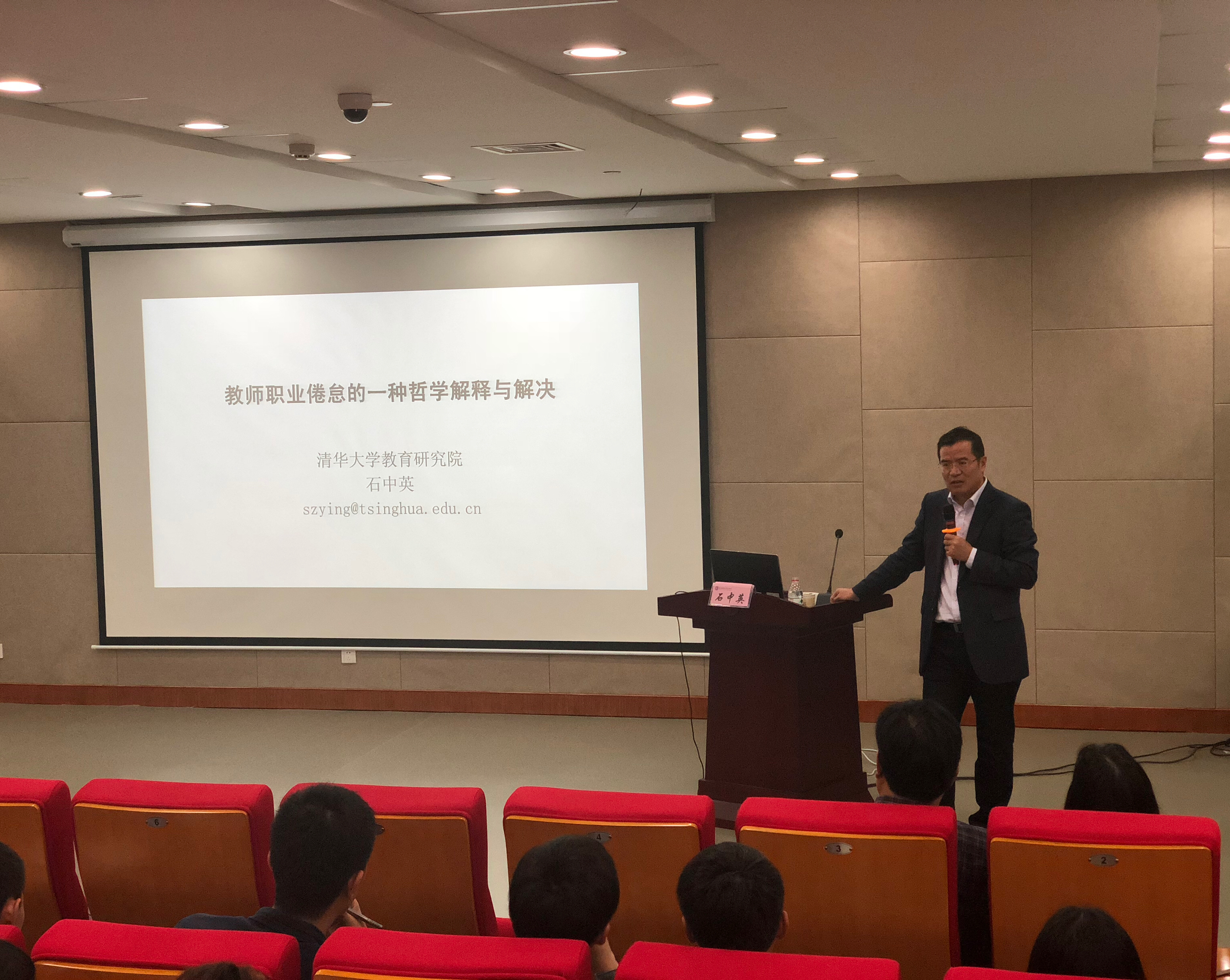聘任仪式结束后,石中英教授做客教育学院太炎教育讲堂,为师生带来题为“教师职业倦怠的一种哲学解释与解决”的学术讲座。讲座中,石中英教授介绍了教师职业倦怠的概念、表现和研究现状,重点对马克思对职业倦怠问题的哲学研究、教师职业倦怠的科学解释和解决教师职业倦怠的四点建议三部分内容进行深入分析。讲座结束后,同学们对石中英教授所讲内容进行了深入思考和激烈讨论,并积极踊跃提问和发言。石中英教授赞扬了同学们高质量的问题,并肯定了同学们勤于思考的学术态度。