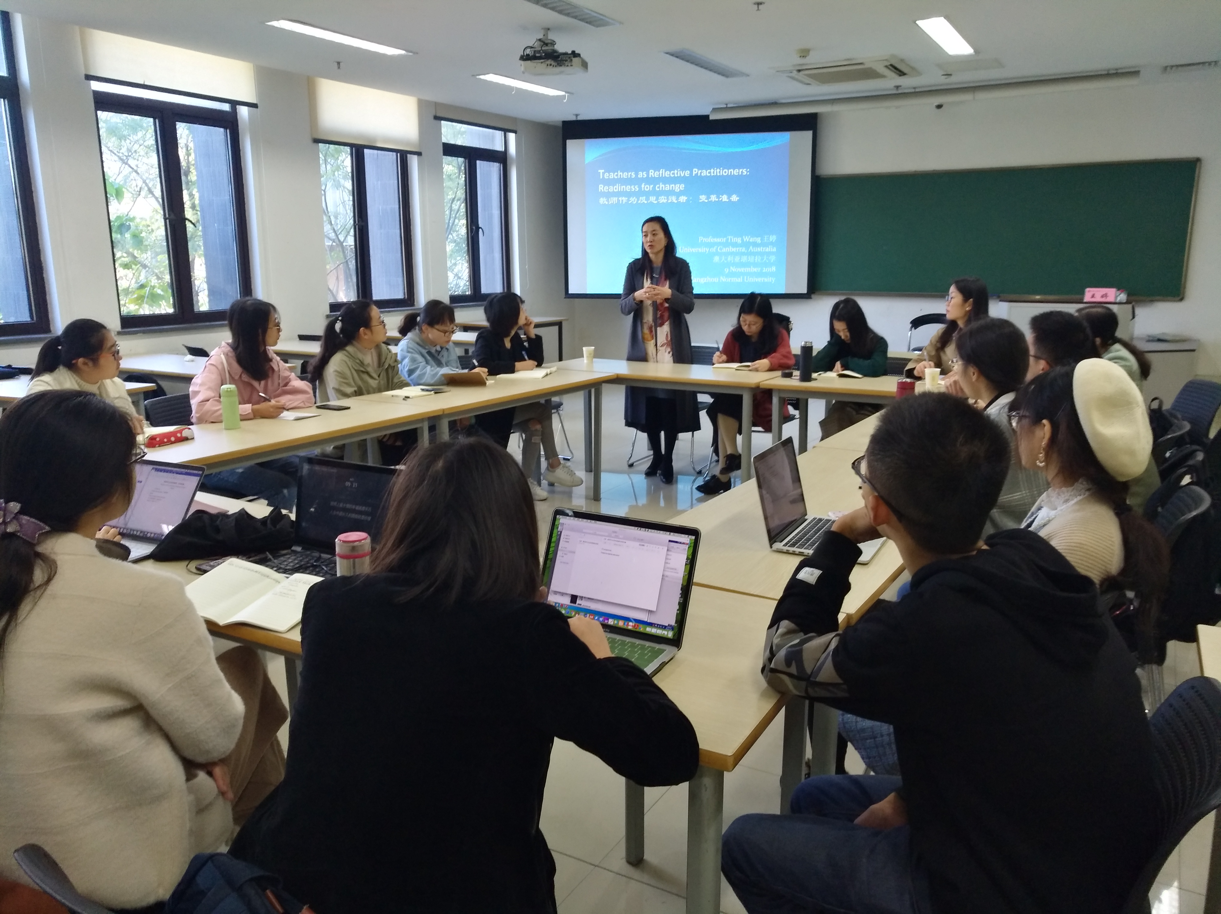 2018年11月9日上午,澳大利亚堪培拉大学教育学院副院长、北京师范大学特聘教授、国家外专局高端外国专家,杭州市钱江特聘专家、杭州师范大学特聘教授王婷做客教育学院,在恕园14-202为天英足球即时比分 师生带来以“教师作为反思实践者:变革准备”为主题的学术分享。由天英足球即时比分 教师许建美老师主持,教育学院师生参加。
