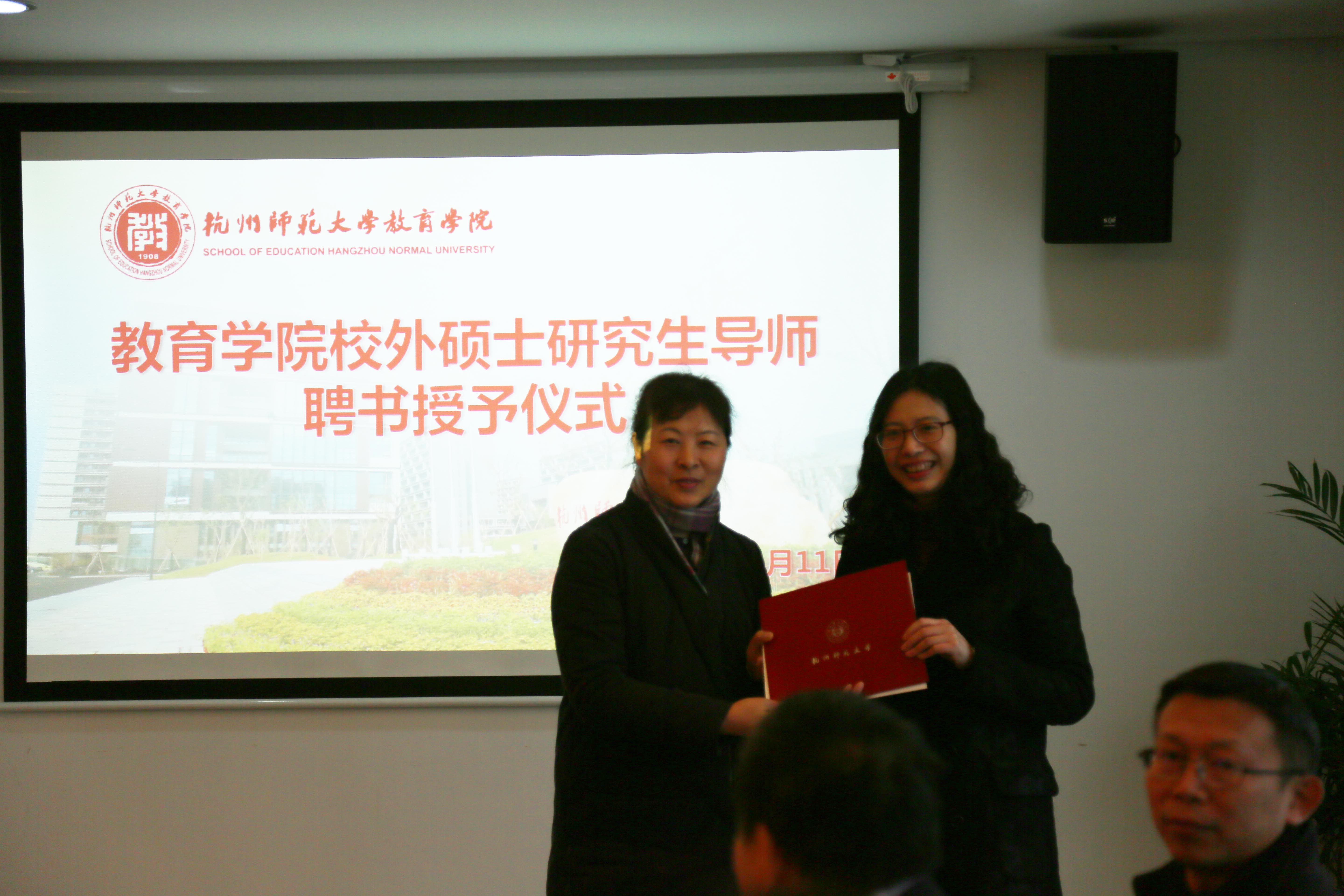 仪式开始,严从根副院长介绍了参会的九名导师。他们分别是杭州师范大学附属医院方妍彤老师,杭州市省府路小学关祥荣老师,杭州市求是教育集团江萍老师,浙江省宁波市奉化区实验小学刘善娜老师,杭州师范大学东城实验学校张立栋老师,杭州市学军小学张军林老师,杭州市青少年活动中心章献明老师,杭州市第七人民医院谭忠林老师,杭州市育才外国语学校、杭州市公益中学潘志平老师。随后教育学院吕静书记依次为这九名校外硕士研究生导师颁发导师聘书。