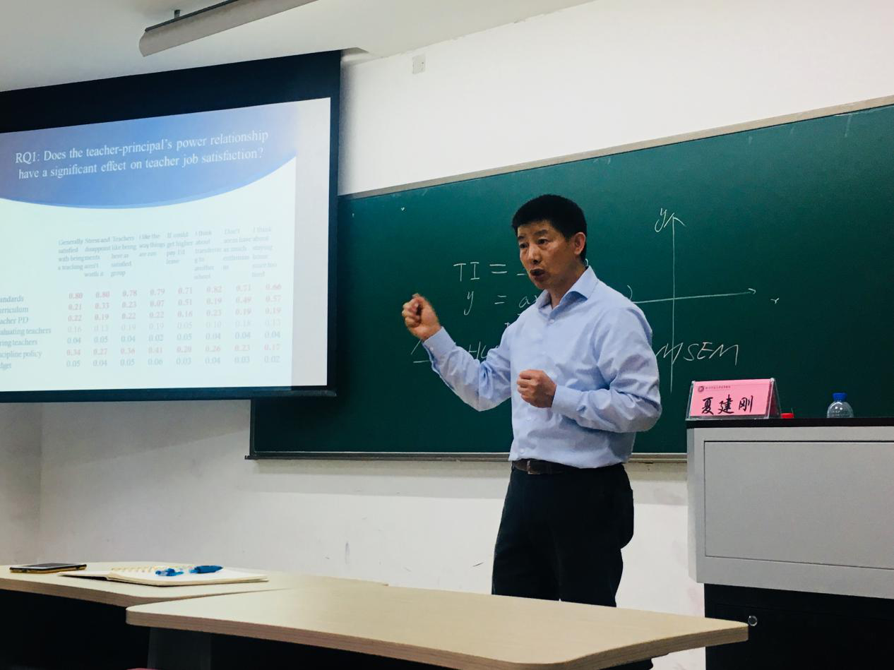 夏建刚老师结合同学们的实际需求和专业情况,将定量研究与学校领导管理相关理论进行了深入浅出地讲授,且用自己的学习成长经历来导入,以消除同学们对定量研究的陌生感。夏建刚老师本次讲座主要结合自己在美国期间的学习研究经验来谈定量研究所能解决的难题。讲座伊始,夏老师展现了定量研究理论的发展,由HLM(MLM)和SEM两种理论,发展到结合二者优势的MSEM。夏老师生动的用一次函数的形式来阐释定量研究的研究成果,以一次函数的形式来解释学校中领导权利和教师权利的关系。之后,再结合他在研究中遇到了如何解释两者的双向关系、如何将此结果运用于对第三者的影响这两个问题,夏老师谈到一次偶然到费城学习定量研究方法时,新学习的MSEM为其研究带来了新突破。除了定量研究方法以及学校领导力的内容,夏老师还为同学们介绍了美国教育领域的数据统计方式和相关机构如SASS。在谈到中国研究生如何展开数据获取和定量分析的问题中,也为大家推荐了如PISA、TALIS的测试机构发布的数据信息,也为大家推荐了更为先进的数据分析系统Mplus。