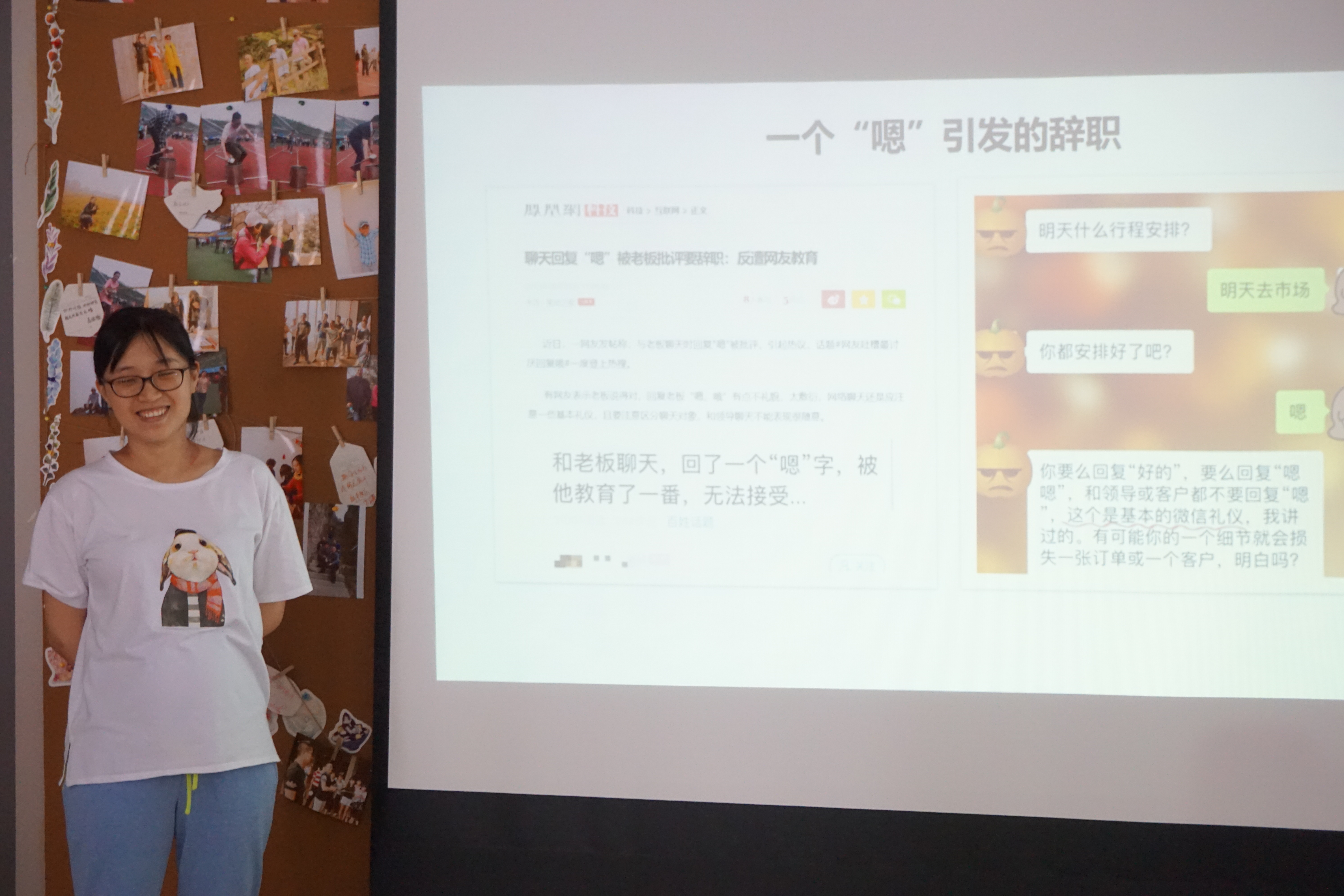 成长训练营也邀请到校团委王倩老师对新任学生干部进行指导。王老师提到学生干部在进行学生组织工作时,可能是一段辛苦的经历;但是通过对各种能力的锻炼,也是一个让自己成长起来的过程。同时,王老师认为学生干部面对事情时,任何时候都要缓事急做和急事缓做,即不急的事情提前做好,就不会手忙脚乱;时间紧迫的事要慢下来细心做,这样才不会出错。王老师和我们分享了几个志愿者在志愿活动中的小故事,告诉我们很多事用心去做才能赢得他人的肯定和赞赏。在与王老师的交流过程中,大家都受益匪浅。