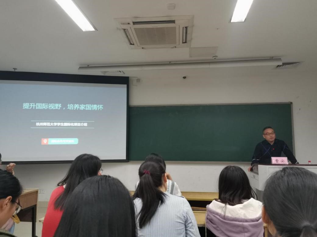 曹老师指出在当前世界交流日益紧密的国际形势下,学生的目光需要放长远,眼界需要更开阔,学生的选择也可以更加多元化、国际化。随后,曹老师向同学们详细介绍了杭师大学生国际项目的分类(包括交换生项目、暑期修学项目等),并仔细解释了海外各知名高校和我校合作交流项目的具体要求、内容以及配套资助鼓励政策。