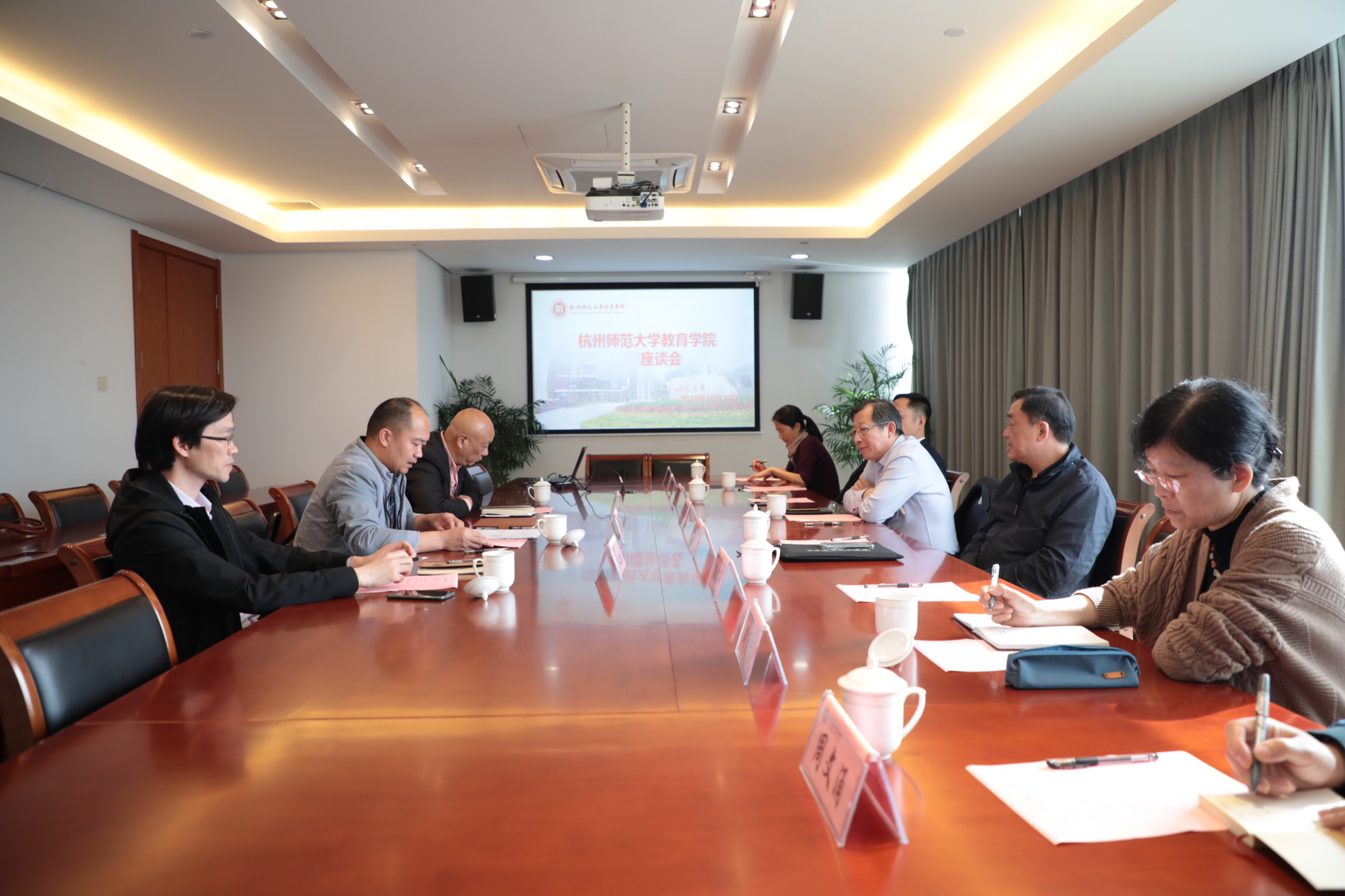 2019年10月29日下午,天英足球即时比分 召开基础教育座谈会。浙江省教育科学研究院院长朱永祥、浙江省考试院副院长冯成火、杭州高级中学校长蔡小雄、杭州公益中学校长潘志平、杭州天长小学校长楼朝晖、杭州竞舟小学校长周爱芬、杭州文澜中学胡柳蔚、杭州职业教育研究所周文涌、天英足球即时比分 执行院长温正胞、副院长严从根、学术委员会主任童富勇参加会议。座谈会由执行院长温正胞主持。