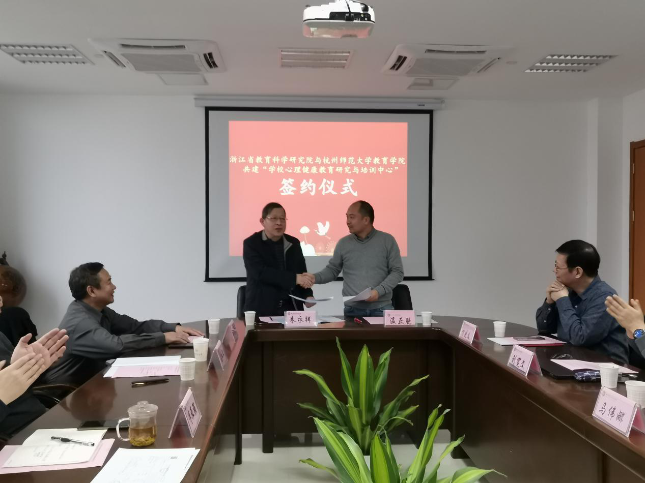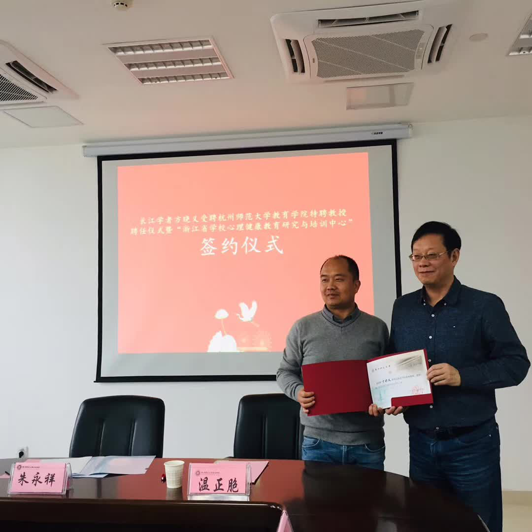聘任仪式后,举行了浙江省教育科学研究院与杭州师范大学教育学院共建“浙江省学校心理健康教育研究与培训中心”的签约仪式。浙江省教科院院长朱永祥与教育学院执行院长温正胞分别代表双方在协议上签字并交换文本。这标志着双方在长期友好合作的基础上,结成了优势互补、强强联合的战略合作伙伴。朱永祥院长、吴贤平副书记、温正胞执行院长在签约仪式上先后致辞,浙江省中小学心理健康教育指导中心办公窒主任庞红卫、教育学院心理系主任马伟娜教授、副主任傅亚强等出席签约仪式。