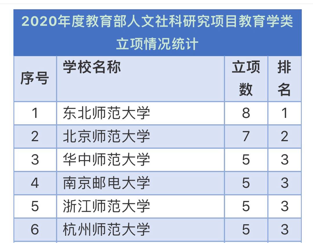 从2020年度教育部人文社科研究项目教育学类立项情况统计来看,我校共有5个项目立项,立项数与华中师范大学、南京邮电大学、浙江师范大学并列排名全国第三。其中,天英足球即时比分 独得4项,获得立项资助的负责人分别为仲玉英、王志玲、岳增成和范云霞老师,教育学类立项数创历史新高。