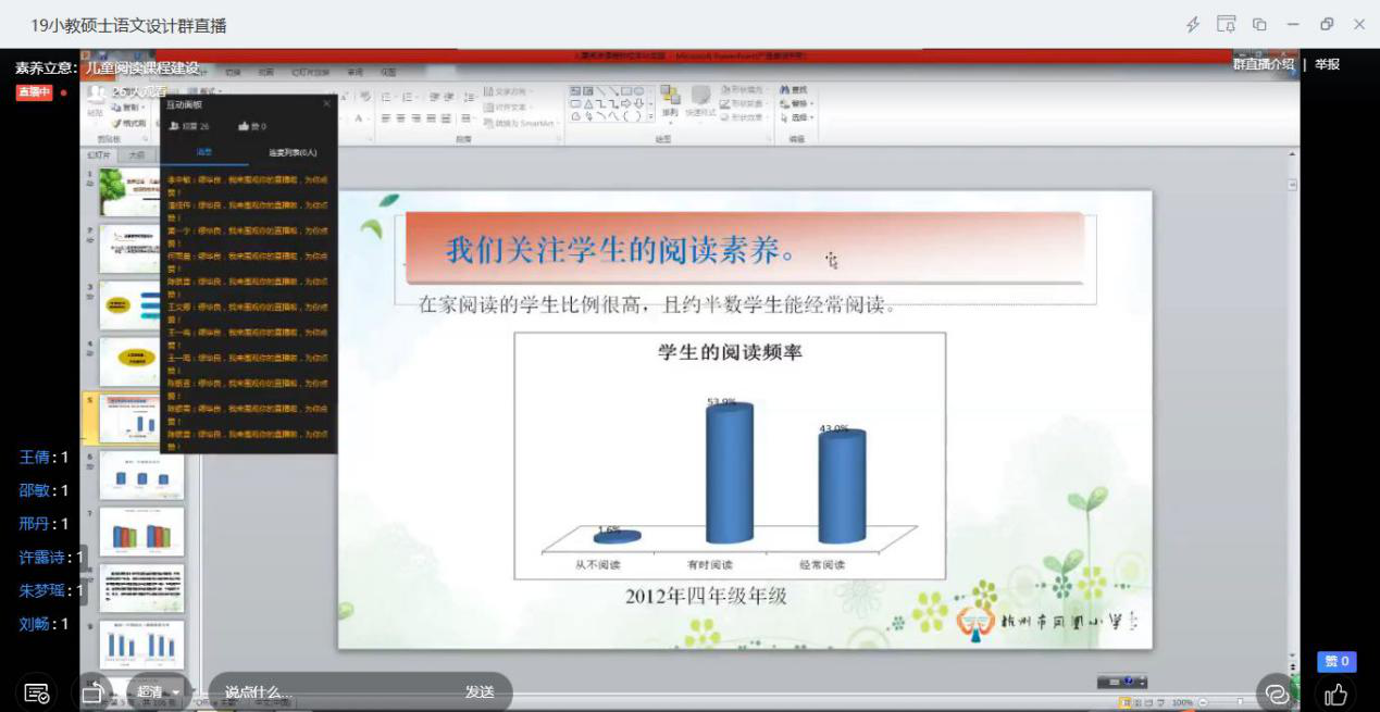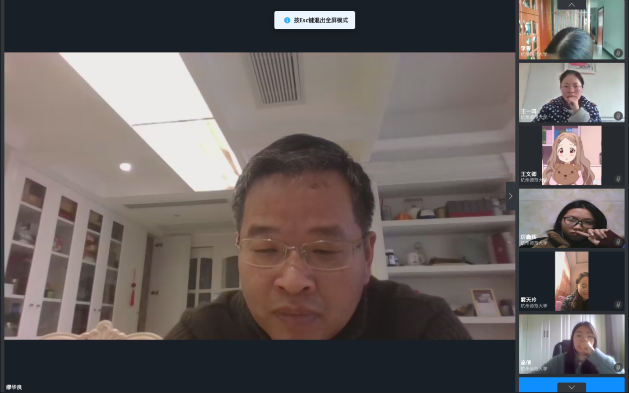 4月2日下午,杭州市凤凰小学校长缪华良云做客杭州师范大学教育学院。缪校长通过钉钉平台在《小学语文学科教学设计与实施》上,为2019级教育硕士语文方向的研究生们授课,授课主题为“素养立意,儿童阅读课程建设的校本化实践”。张老师结合凤凰小学阅读课程的建设实践,深入浅出地向同学们讲解了什么是阅读课程以及如何开设儿童阅读课程,干货满满,精彩不断。