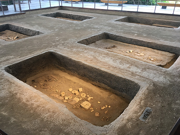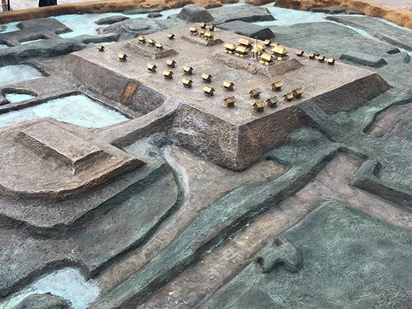 A model of Mojiaoshan Terrace, which is believed to be the palatial complex, is displayed in the archaeolgical ruins park of Liangzhu city.
