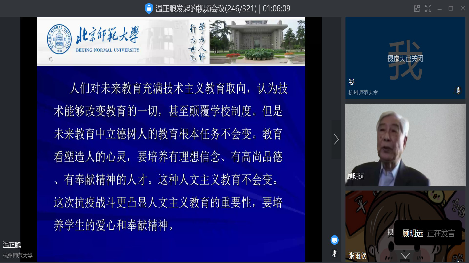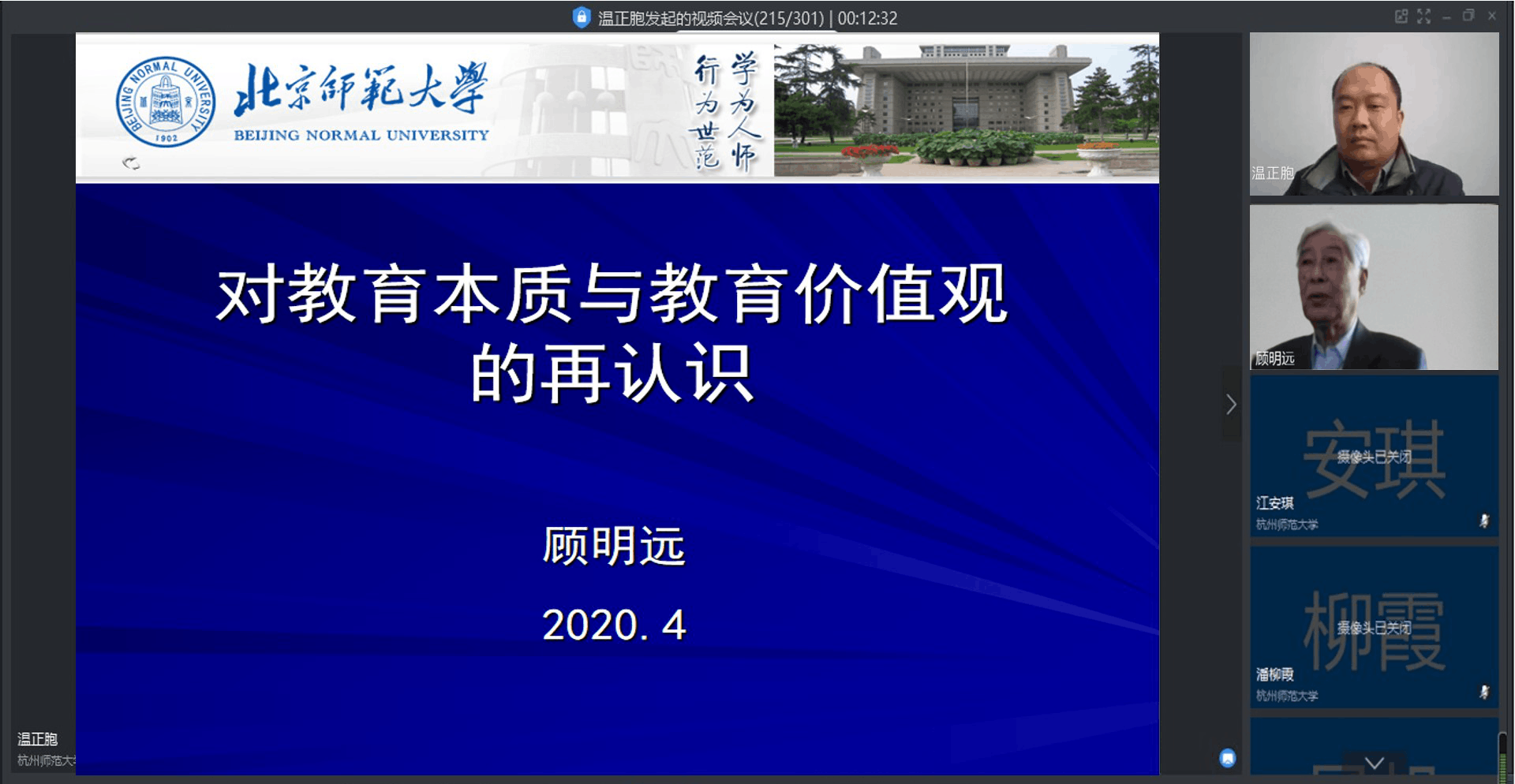 2020年4月22日下午,杭州师范大学教育学院第一期“太炎教育云端讲堂”成功在钉钉线上交流平台举行。本次讲堂有幸请到中国教育学会名誉会长、北京师范大学资深教授顾明远先生,做题为“对教育本质和教育价值观的再认识”的学术报告。讲堂由教育学院执行院长温正胞教授主持,天英足球即时比分 300余名师生参加。