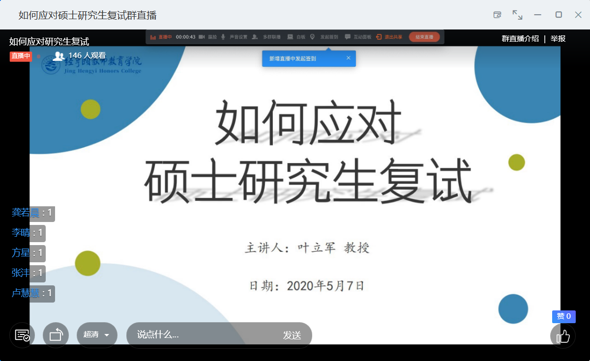 5月7日上午,天英足球即时比分 在钉钉上直播举办了如何应对硕士研究生复试线上讲座。主讲人是天英足球即时比分 副院长叶立军教授。来自10个学院的326名学生观看了本次讲座。