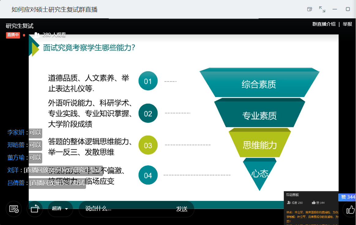 通过本次讲座,同学们对硕士研究生复试有了更加深入全面的了解,相信同学们在准备复试时能有更高的效率。