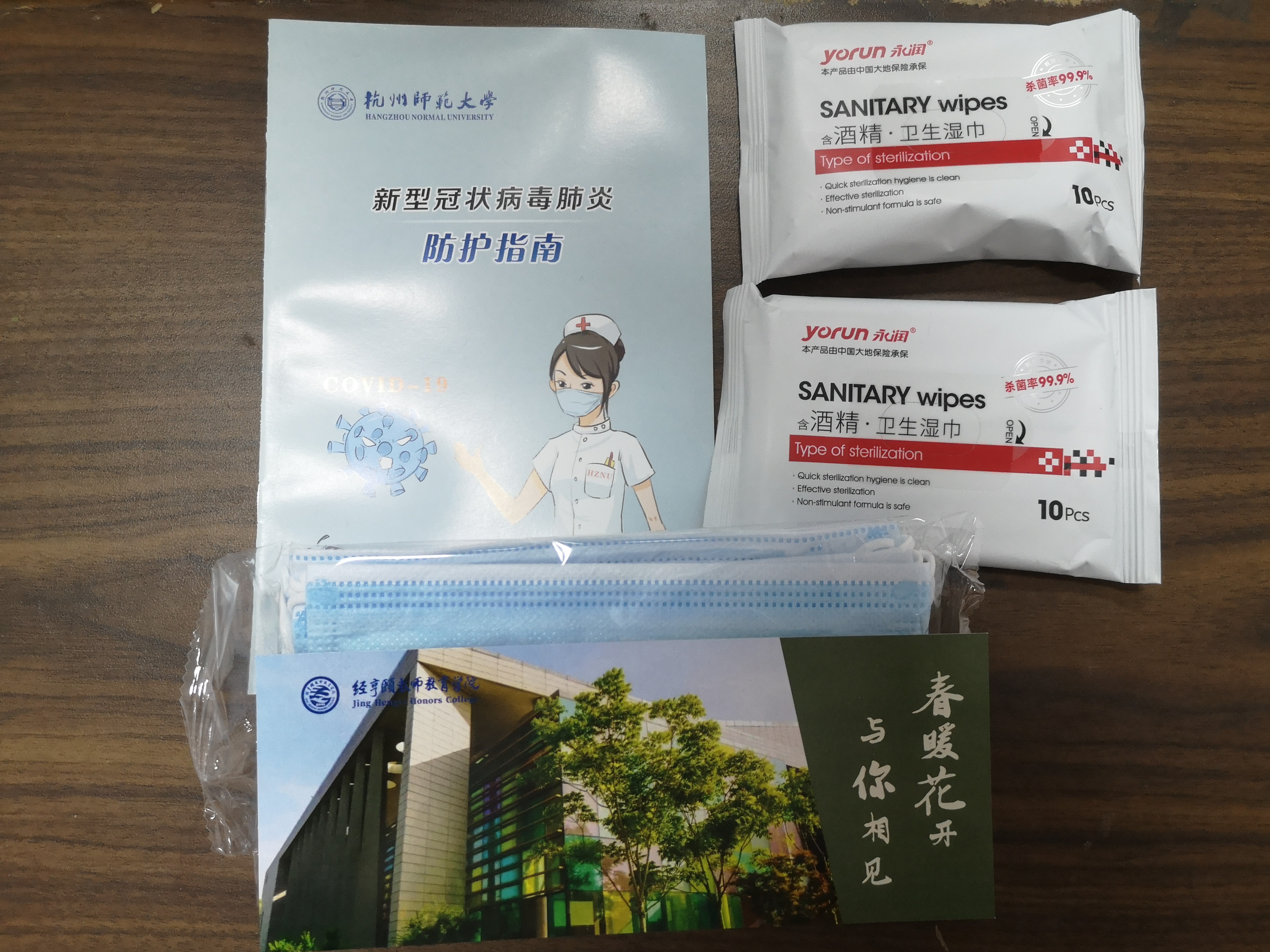 健康包里有学院为大家准备的十个一次性口罩、一本防护指南小册子、两包酒精消毒湿巾和一张书签。“春暖花开、与你相见”,学院特别提醒同学们返校后要继续做好防控措施,保障自身的健康。