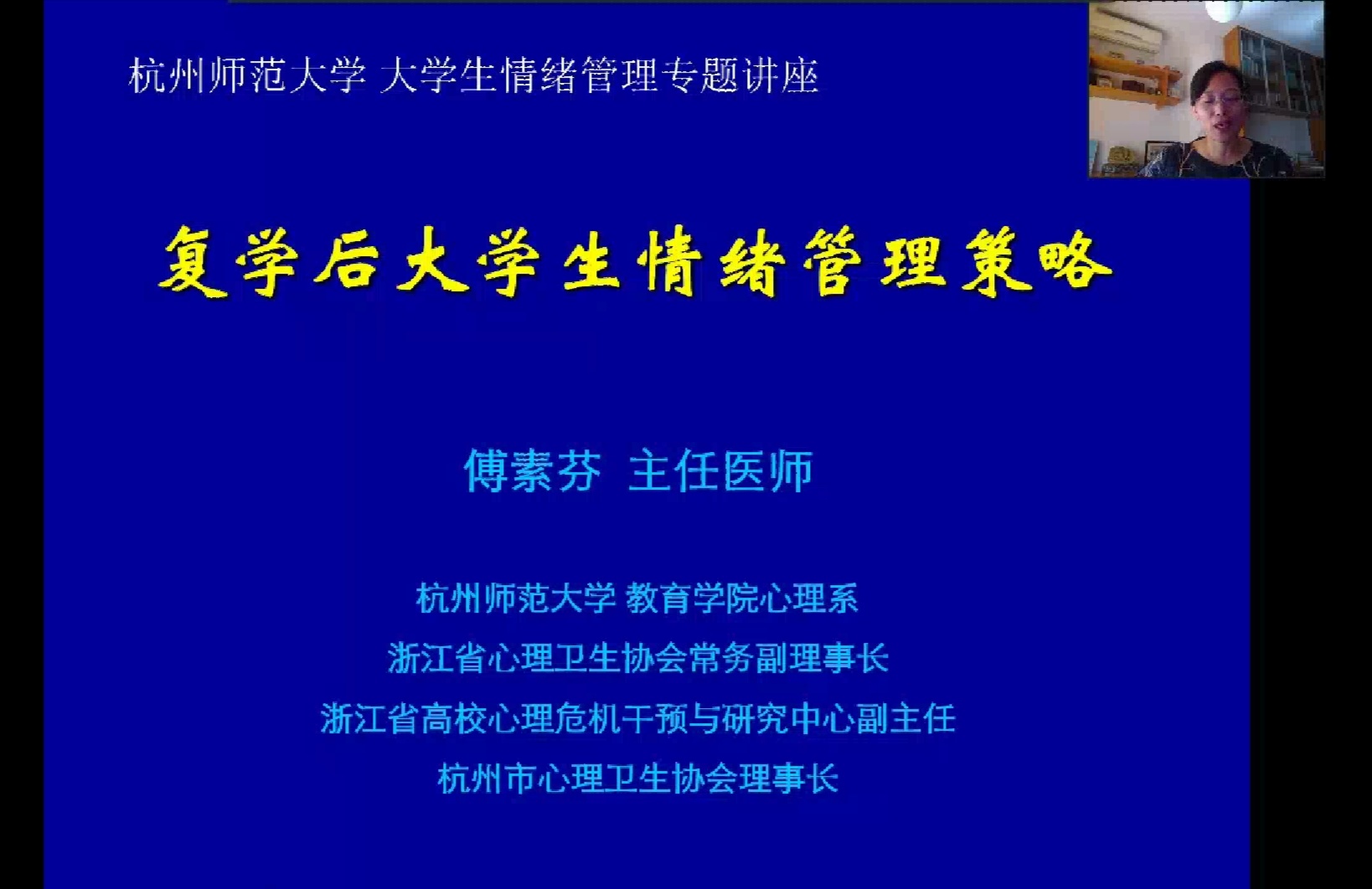5月20日下午两点半,在这个充满了浪漫氛围的日子里,我院全体同学迎来了一场名为《复学后大学生情绪管理策略》的线上专题讲座。学院特邀了心理学系教授、浙江省心理卫生协会常务副会长傅素芬老师,通过钉钉在线直播的方式,为全体同学带来了一场生动有趣的讲座。