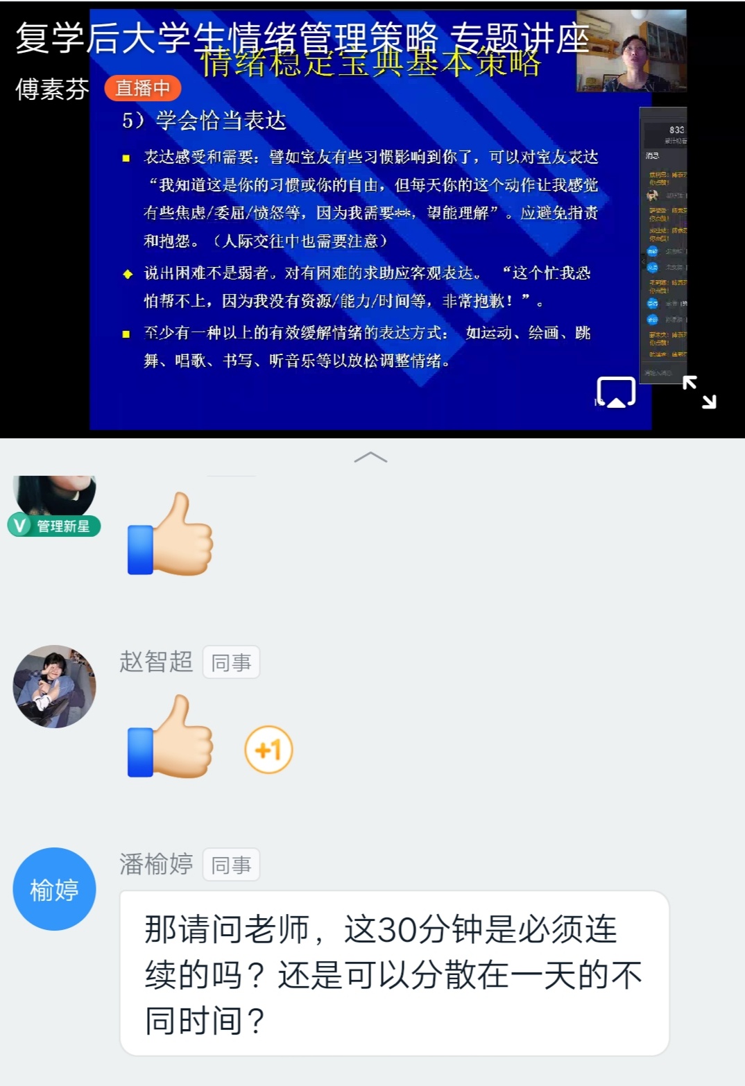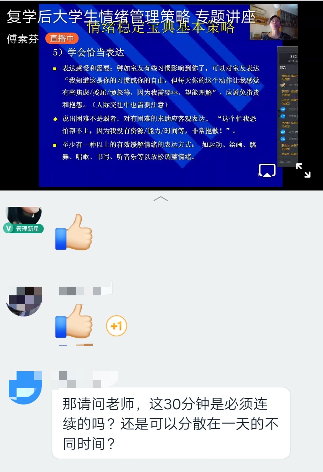 讲座中,同学们对傅老师控制自我情绪的方法和建议非常赞同,纷纷为傅老师点赞,互动区的反应也愈加热烈。