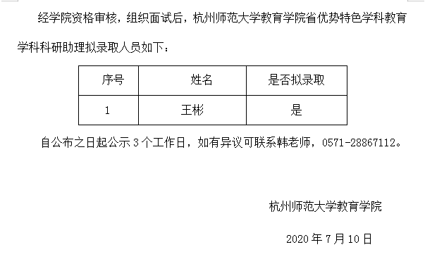 经学院资格审核,组织面试后,杭州师范大学教育学院招聘实验员拟录取人员如下:
