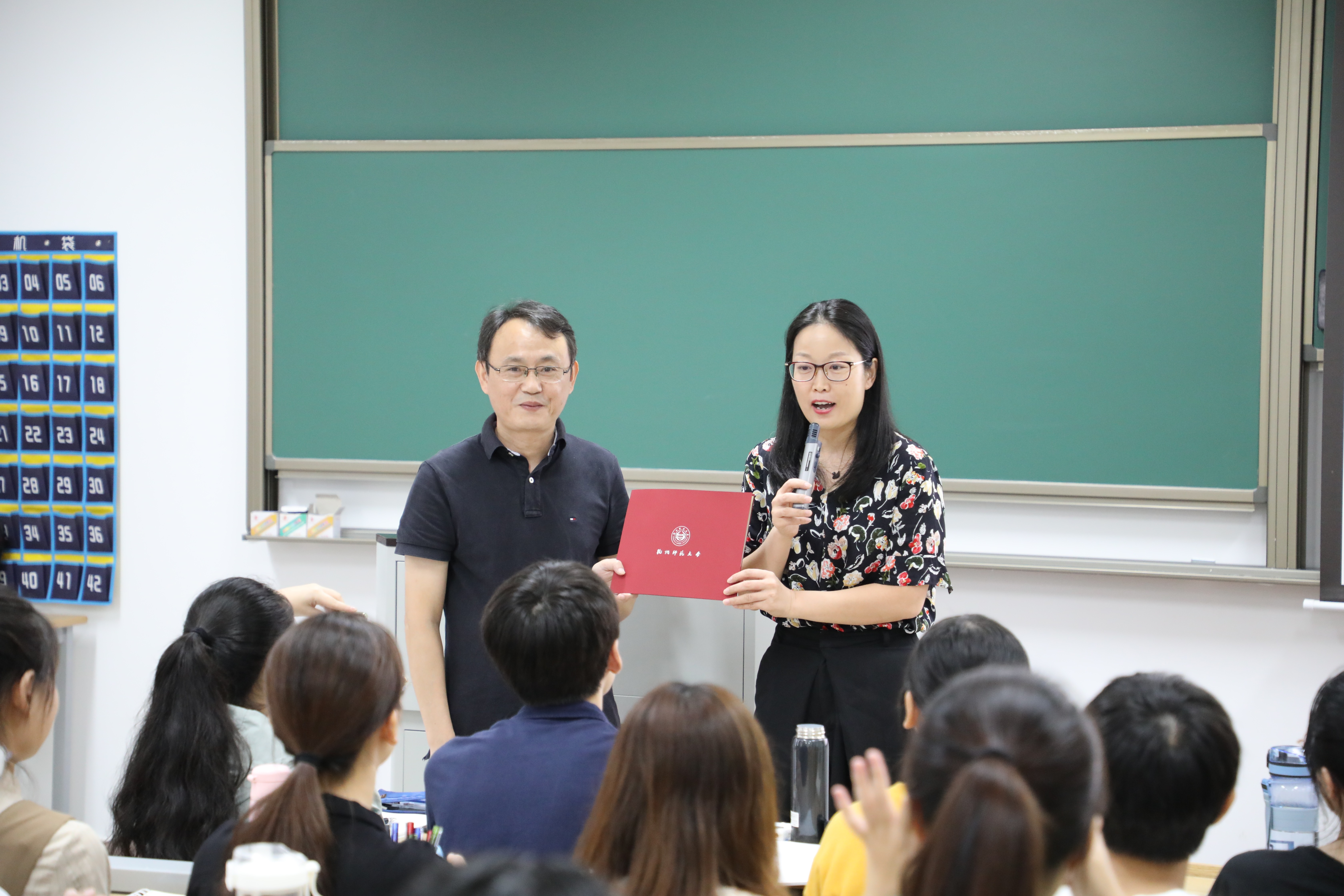在课程开始前的聘任仪式上,教育学院教学副院长许建美为王自文老师颁发了“双师课程”任课教师聘书。据许院长介绍,积极推进教师教育课程改革,探索提升教学效果的新途径是教育学院本科教学工作的重点。此次的“双师课程”改革既不同于以往课堂上请一线老师做讲座的形式,也不是职业教育领域“双师型”的教师。教师教育的“双师课程”是大学教师和实践界优秀教师共同开发和实施的课程。其突出特点体现在双师全程参与、课堂多元互动、理论与实践自然交融上。