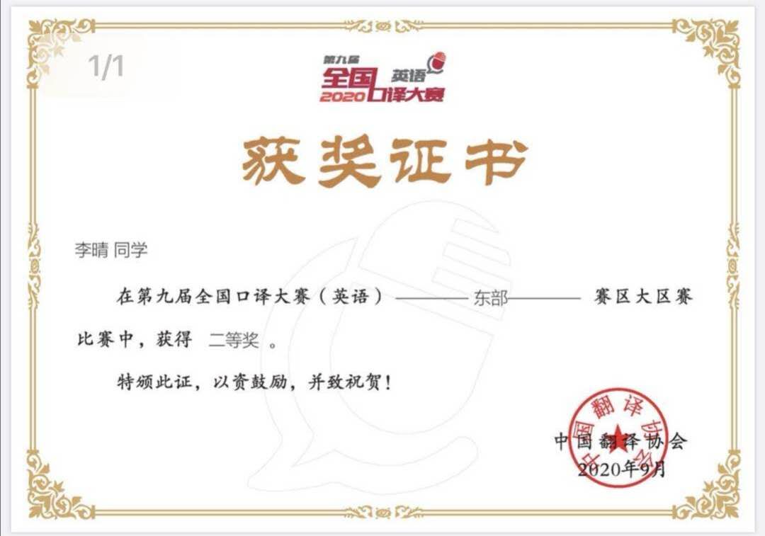 天英足球即时比分 李晴同学荣获第九届全国口译大赛(英语)大区赛二等奖