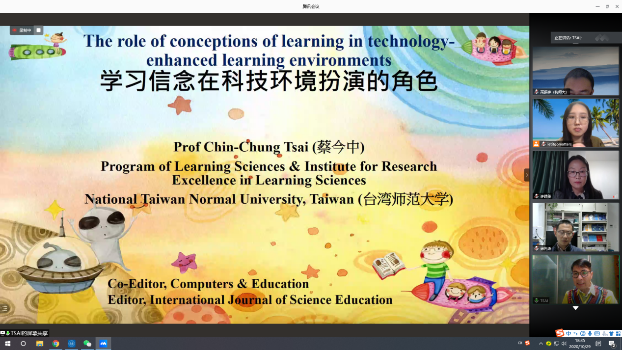 2020年10月29日晚,杭州师范大学国际哲学与人文科学理事会教席合作办公室特邀台湾师范大学学习资讯学院院长、学习科学跨国顶尖研究中心主任蔡今中教授做题为“学习信念在科技环境中扮演的角色”(The Role of Conceptions of Learning in Technology-enhanced Learning Environments)的讲座。此次讲座是教席合作办公室儿童研究系列讲座第一讲。讲座由教育学院副院长许建美副教授主持,教育学院教育技术系系主任杨俊峰教授以及副系主任徐光涛副教授为特邀与谈人,办公室执行秘书高振宇副教授也参加了本次讲座。