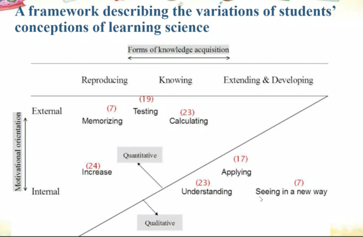 蔡教授结合自身担任科学教师的经历,将儿童的学习信念与学习内容相结合,进一步推进了针对高中生对科学学习看法的研究,得出7大类台湾高中生对学习科学的看法,并用Phenomenongraphic Analysis(现象描述分析法)处理研究数据,得出研究对象对科学学科看法的分布情况,发现大部分研究对象的学习信念处于信念层级结构的中阶。