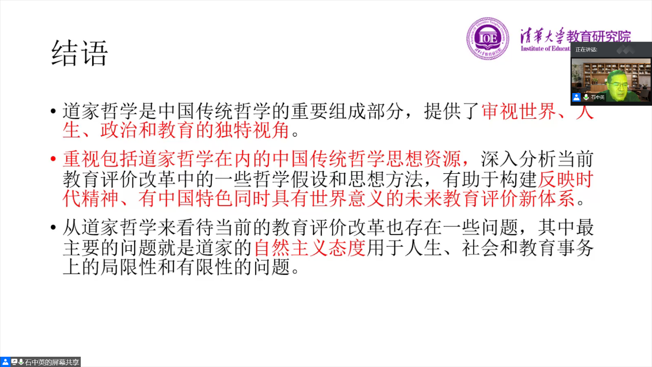 此后,石教授重点为我们上述道家哲学的主张对当前教育评价改革的重要启示。第一,在本体论方面,鉴于当前我们对教育本质以及本体论把握的不确定性,指出了道家哲学启示评价者应对教育本体保持“敬畏之心”,努力使评价作为一种审慎的理智活动,在此基础上引出对道家“至誉无誉”的两种解释。第二,道家在物性和人性论方面对我们的启示在于我们要正确定位教育评价的目的,注重帮助评价对象更好的表现内在性质。第三,价值论启示教育评价者认识评价对象的内在价值的不可比较,将其与美国学者杜威的相关理论进行对比。第四,道家哲学的核心教育主张启发教育评价者重视评价文化的建设,树立正确的评价价值观。