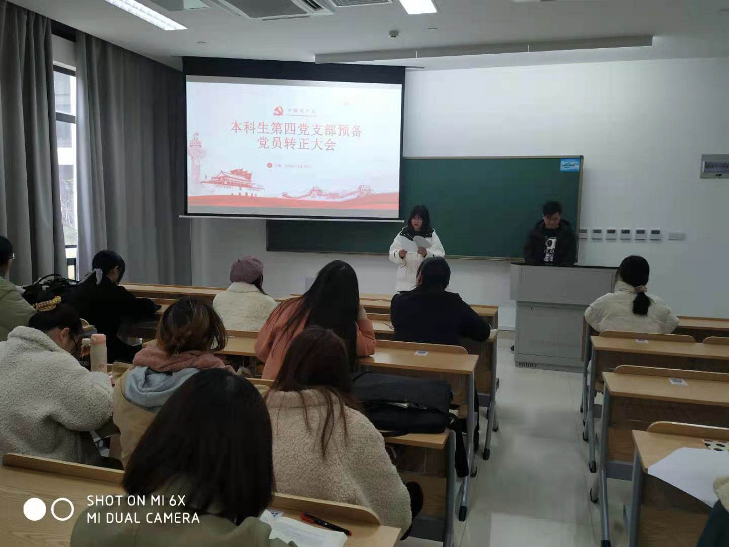 首先,4名申请转正的同志依次上台宣读转正申请书,汇报了自己在预备期里学习、工作、生活以及思想方面的进步和收获,表达了加入中国共产党的决心。之后,在当事人回避的情况下,3名正式党员以无记名投票的方式对4名同志的转正申请进行表决。经投票,全体正式党员一致同意朱欢等4名预备党员转为正式中共党员。最后,由支部书记程骁老师作总结性发言,强调所有党员在今后的学习生活中,要更加主动、刻苦和务实,在思想和行动上时刻与党组织保持一致,严格遵守党的规章制度,为党组织做出贡献。