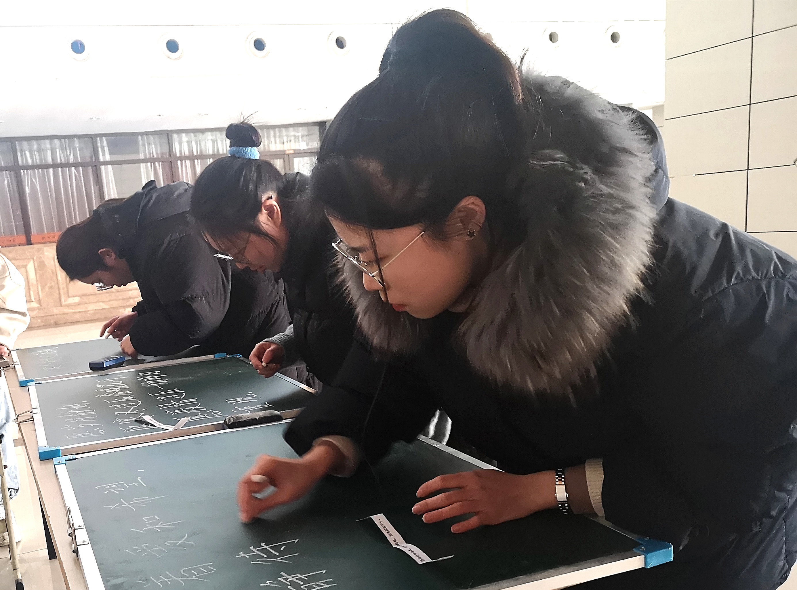 冬日的暖阳照亮比赛现场,参赛的同学们拎着小黑板陆陆续续地到来。抽取题目,领取粉笔和黑板擦,找到一张空桌子,参赛选手便开始认真地书写。选手们弯着腰,紧握粉笔,对每个字的每个笔画精心琢磨修改。而在比赛中,也不鲜同学们互相检查和传授经验的身影,现场充满了互帮互助的和谐比赛氛围。