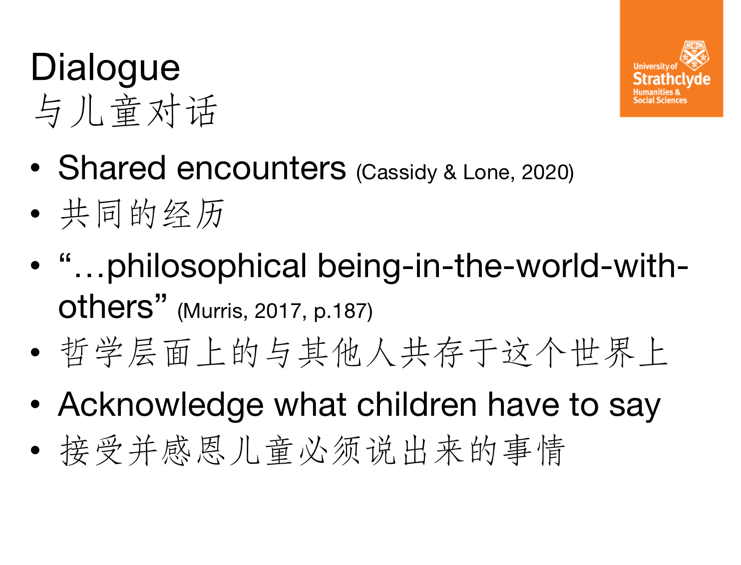 Regarding the existence of children in this world, Professor Claire pointed out that everything in the world is inextricably linked to children. We should connect to each other in a dialogue. These dialogues are shared experiences with others, allowing us to explore values in them and consider how to make them happen. It is worth noting that adults may be more inclined to some inherent views, so in the process of dialogue, adults may need to give up some assumptions and ideas that they have firmly grasped.