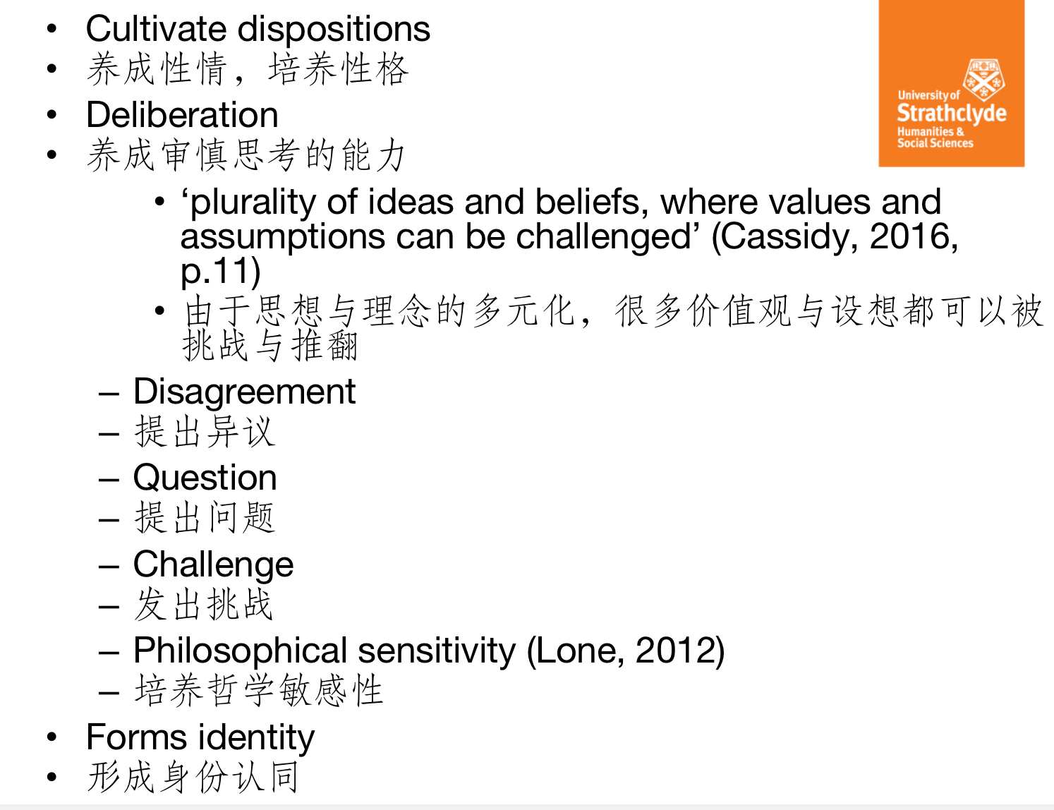 Professor Claire further pointed out that dialogue helps children cultivate dispositions and deliberations. She suggests deliberation is necessary if a healthy democracy or a healthy society generally is to be supported with the plurality of ideas and beliefs where values and assumptions can be challenged. Philosophical dialogue thus also promotes the formation of identity.