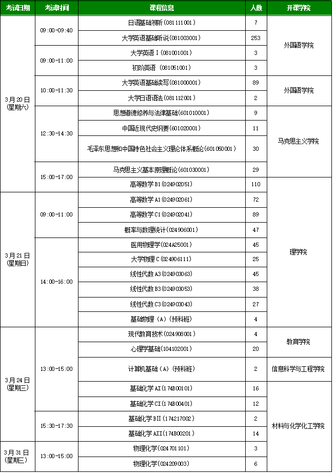 2020-2021-2学期初补(缓)考公共课安排