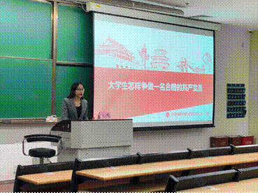 图为沈嫣老师主持党课《大学生怎样争做一名合格的共产党员》