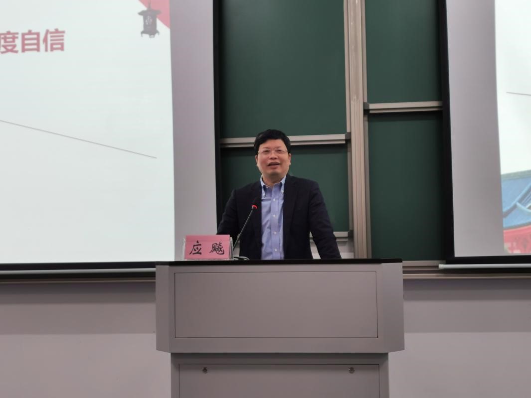 师生作题为“百年变局与制度自信”的主题报告。学院全体师生党员参加讲座。