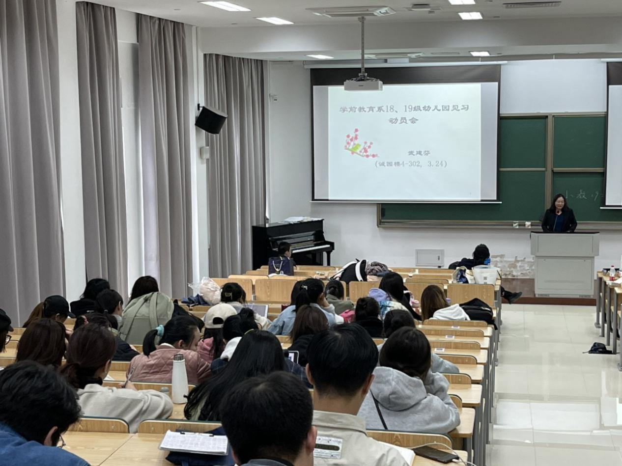 学前教育专业18、19级见习会议于3月24日,(周三)下午3:30在诚园4-302召开。本次动员由学前教育学系博士,学前教育系系副主任武建芬老师主讲。首先,武老师向大家清晰地展示了教育见习的计划安排表,使同学们能更清楚地了解见习的活动安排。紧接着,武老师提出了教育见习的具体入园要求,比如入园见实习前要做健康体检,比如遵照实习手册佩戴实习生证,注意安全,保质保量开展见习和实践。