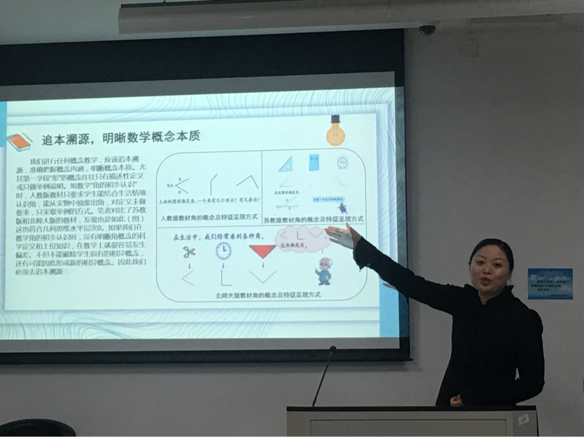 苏老师针对学生相异概念难题,提出以下解决措施。第一,追本溯源,明晰数学概念本质。教师在进行概念教学时,务必准确把握概念内涵。如教学“角的初步认识”,学生不仅达到从实物中抽象出角的模型,还需对角的概念进行辨析。第二,直击焦点,暴露学生相异概念。尤其是在课堂导入环节,“开门见山”式的导入更容易定位学生知识认知。第三,引发冲突,重构准确数学概念。学习是主动建构的过程,教师不能一味的追求所谓的“顺利教学”,适时地制造冲突,激化矛盾,会产生动摇学生头脑中顽固概念的契机。第四,多元操作,巩固数学概念图示。结合课例,借助画角、做角极易渗透角概念的动态图示。第五,沟通统整,形成数学概念体系。尤其是在单元教学中,师生要善于前延后连,串连成线,避免知识的零散化。教师可借助思维导图的形式联接成网。最后,苏老师表达了对我们未来成为一名小学数学教师的教育期盼,当老师需拥有敬业和爱心,智慧就会源源不断,教与学就会成为多赢。