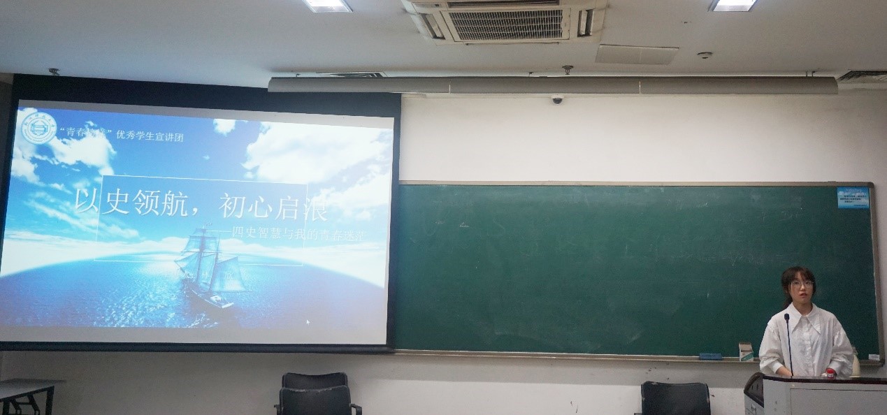 首先,来自公共管理学院的林欣同学带来“以史领航,初心启浪——四史智慧与我的青春迷茫”主题宣讲。宣讲分为四个部分,第一部分为“红船启航”,林欣从《启航》油画出发,介绍中国共产党的诞生历程,表现“应做历史的有心人”;在第二部分中,围绕“丹史启浪”,林欣为同学们介绍了宣讲团的宣讲历程;第三部分为“青年入海”,一首《入海》体现了当今青年应当树立远大理想,勇做强力后浪,为社会做贡献。