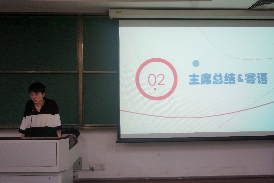随后,学生会主席张志达进行发言。根据各部门的汇报总结,他着重提到了如何找到各部门合作最优解,如何提高工作积极性等问题,也再次谈到了热爱和初心。他认为每个人都要明确自己的目标并为之坚持,并希望下一届学生会能够再接再厉,创造佳绩。