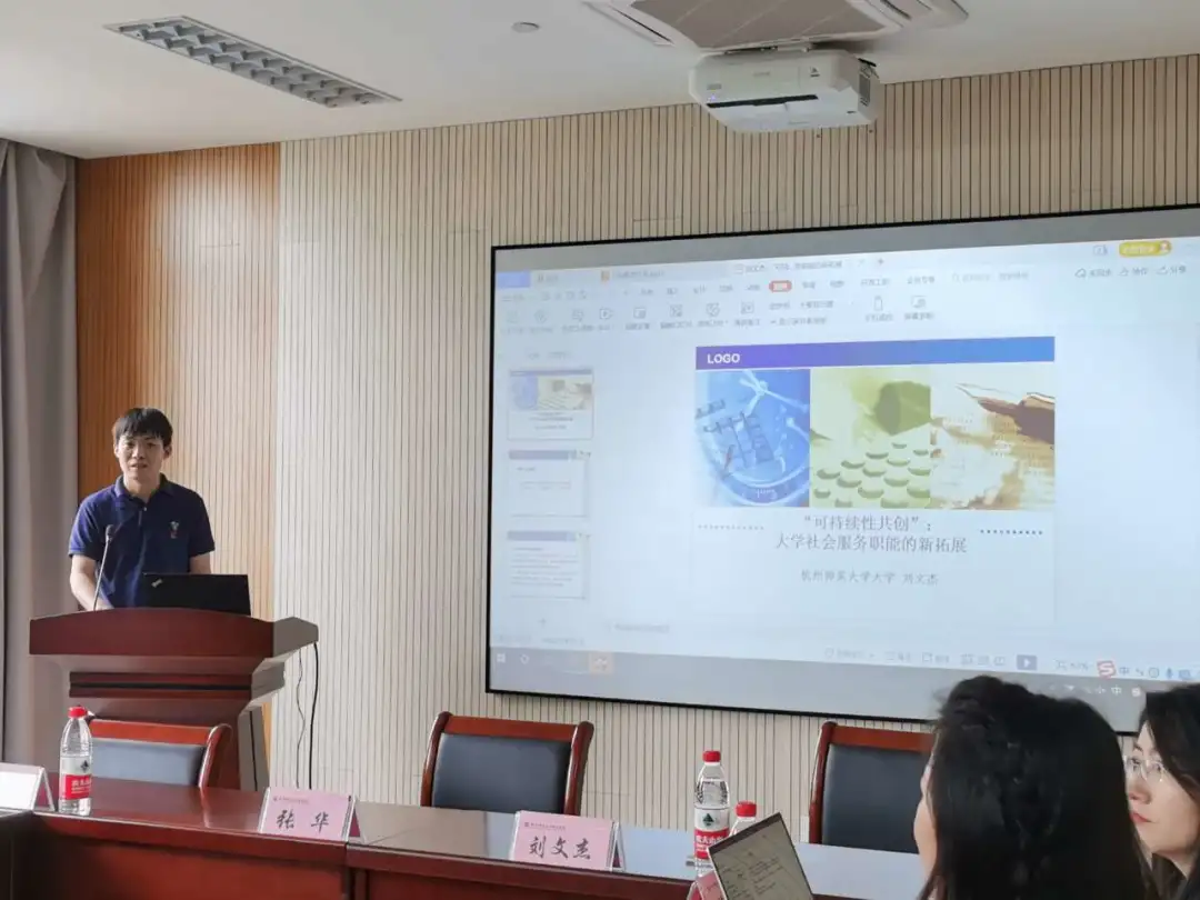 活动的第一个主题是由刘文杰博士介绍有关“‘可持续性共创’大学社会服务职能的新动向”的探讨。刘博士从大学的基本职能介绍和大学社会服务职能的嬗变进入主题,主要讲述了“可持续性共创”的背景缘起、内涵特征以及运作模式,并在发言最后提出了自己的思考与启示。大学可持续性共创的出现是对社会可持续发展危机的学术回应,它在可持续发展理念基础上通过合作创新建立起一种用于促进经济、社会和环境共同发展的方案,从而推动城市或地区的全面发展。刘博士在最后讲到,大学可持续性共创活动在一定程度上拓展了传统社会服务职能的空间,进一步强化了大学与社会公众利益和社会场地的关系,它的确是一种进步。
