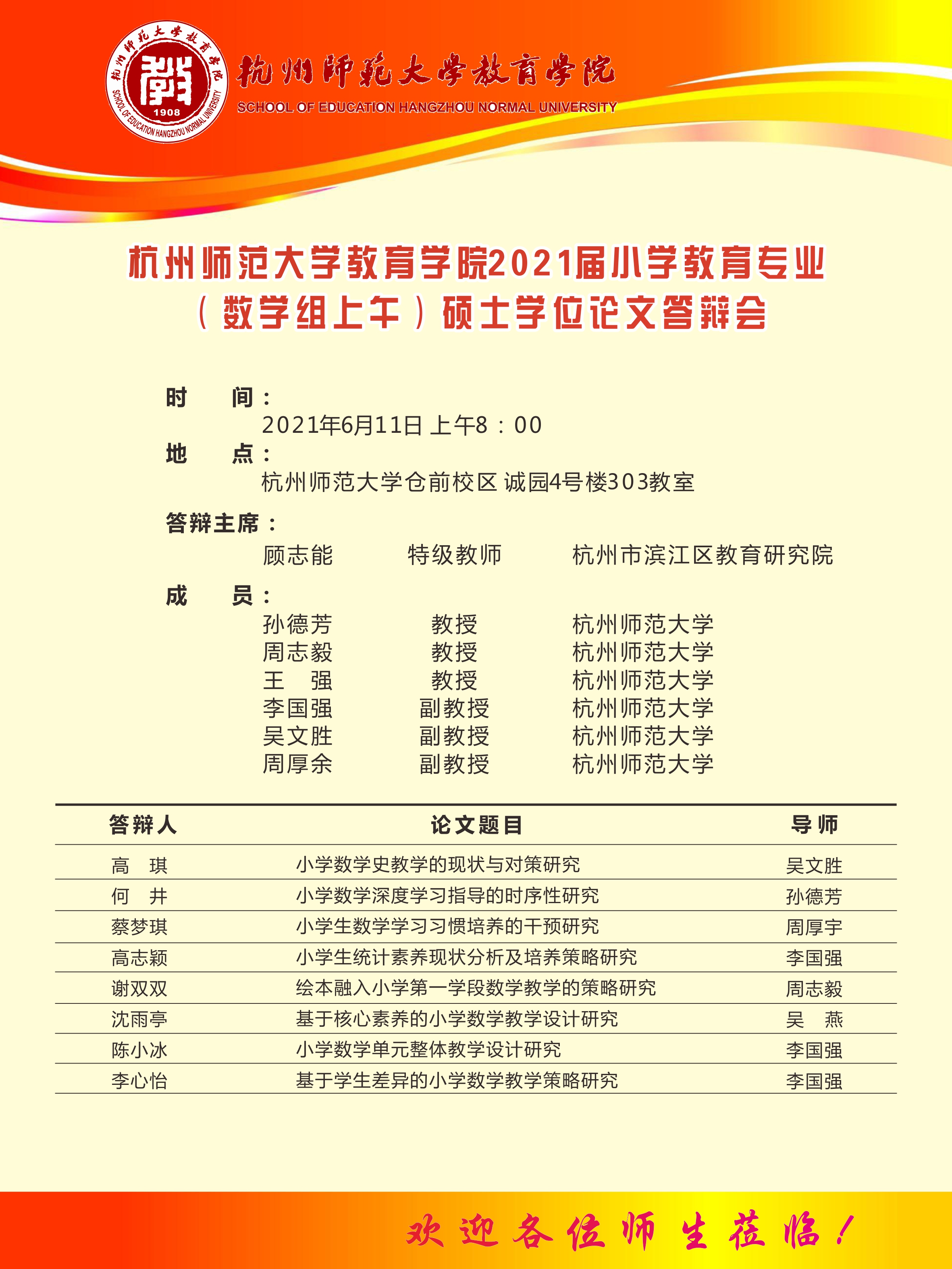 杭州师范大学教育学院2021届小学教育专业(数学组上午)硕士学位论文答辩会