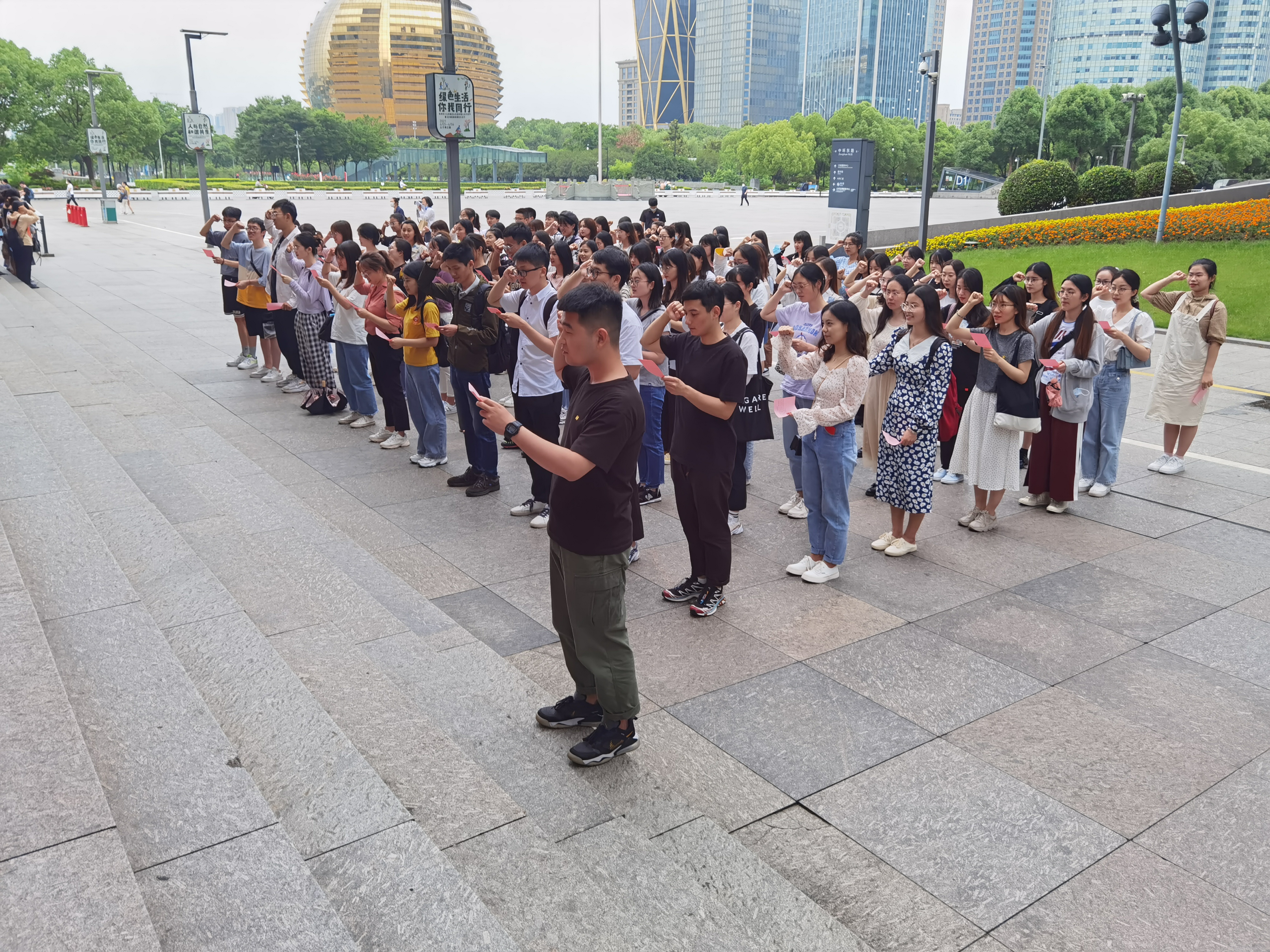 在参观学习前,百名学生党员对着党旗,共同重温入党誓词。在2020级教育学心理学研究生党支部书记马培源的带领下,百名学生党员一起高举右手,面对党旗,再次庄重宣誓:“我志愿加入中国共产党……随时准备为党和人民牺牲一切,永不叛党。”铿锵恢宏的誓词,强烈震撼着在场每一位党员,重温了入党初心,坚定了入党使命。