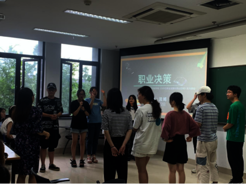 首先,沈嫣老师带领同学们玩了一个“老虎-猎人-枪”的游戏。通过小组之间的游戏对决,沈老师在游戏中不断的让同学们做出决策。这也引出了课程的重点:人生就是一个不断决策的过程,职业就是人生中一个重大的决策。