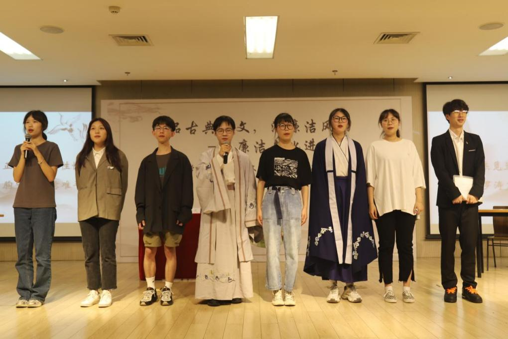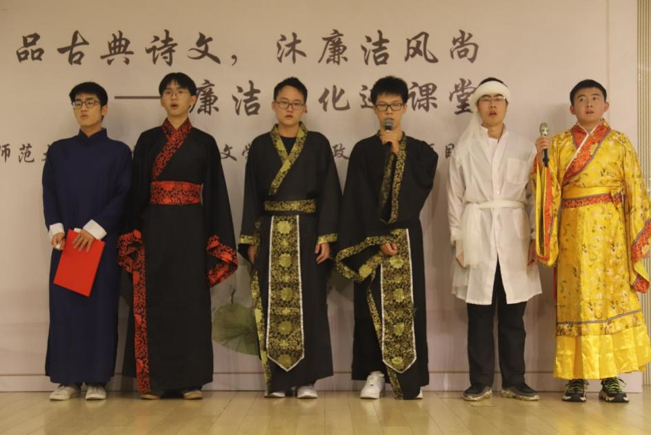 现场的展示形式多样,在歌声中,同学们唱出了廉洁的古时真谛,也表现了廉洁在当下的时代新意;在书法中,同学们挥洒古人写下的名句,从中吸收古人留下的精神品性;在绘画中,借物抒怀,以描绘石、竹、兰,展现古诗词中蕴含的高洁品格;在相声中,通过说学逗唱,生动阐释成由勤俭败由奢的故事;在舞台剧中,真实再现故事场景,别有一番精彩。