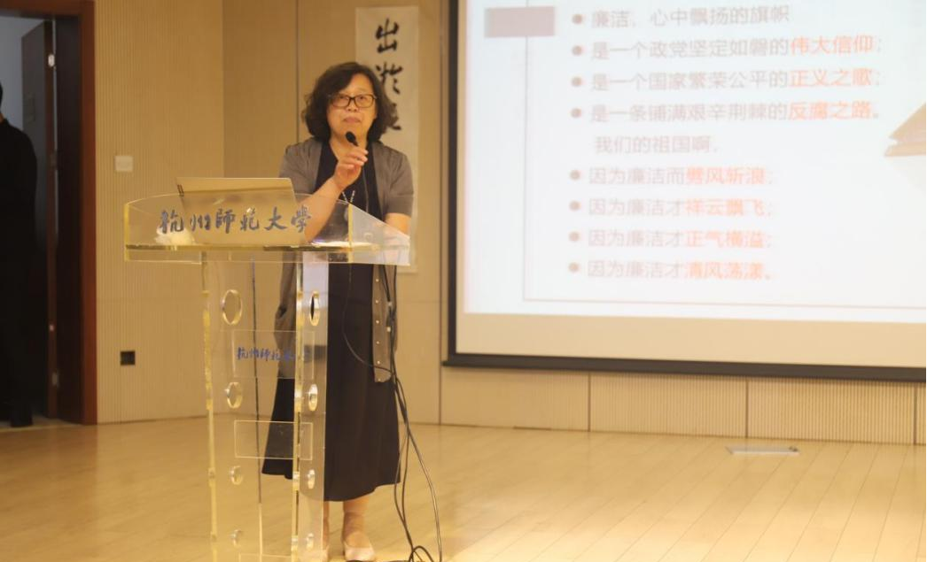 蒋璐敏老师在开幕致辞中对此次活动的开展给予高度肯定,在过去的一个学期里,小学教育专业中国文学课利用课前十分钟,学生们以小组的方式,将蕴含廉洁元素的中国古代文学作品,以青年人喜闻乐见的方式进行演绎和展示,这既是中国文学课程思政的成果,也是传递廉洁文化、廉洁精神的有效载体,对师范生的思想品德发展具有重要意义。