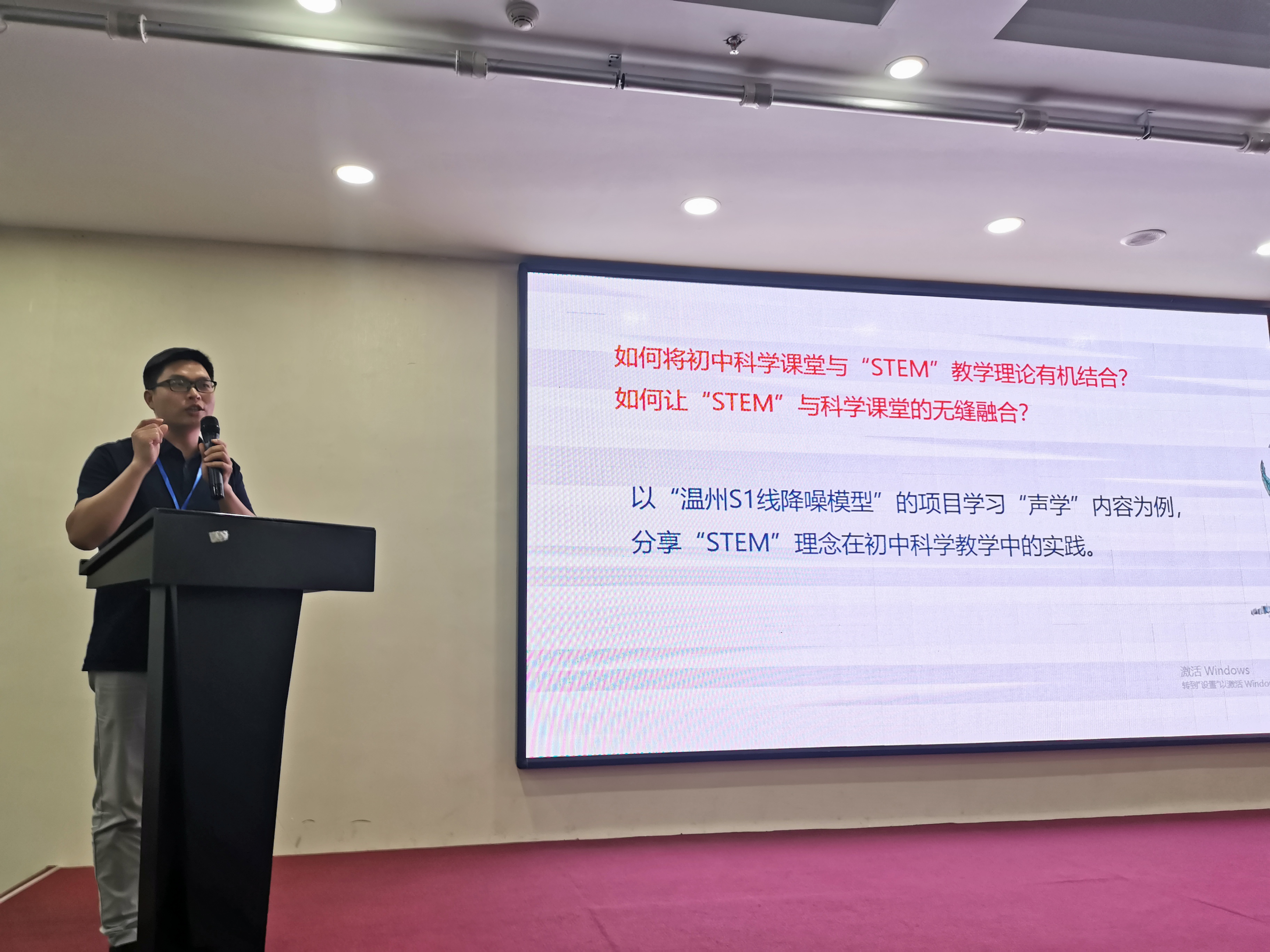 吴锡理老师发言的主题是《STEM理念在初中科学课中的实践与思考》,将“STEM”理念融合于初中科学课堂教学,是促进有效教学的一种新的教学模式与载体,是提升学生课堂自主建构的一种有效手段。吴老师结合自己的实践讲诉了如何将初中科学课堂与“STEM”教学理论有机结合。
