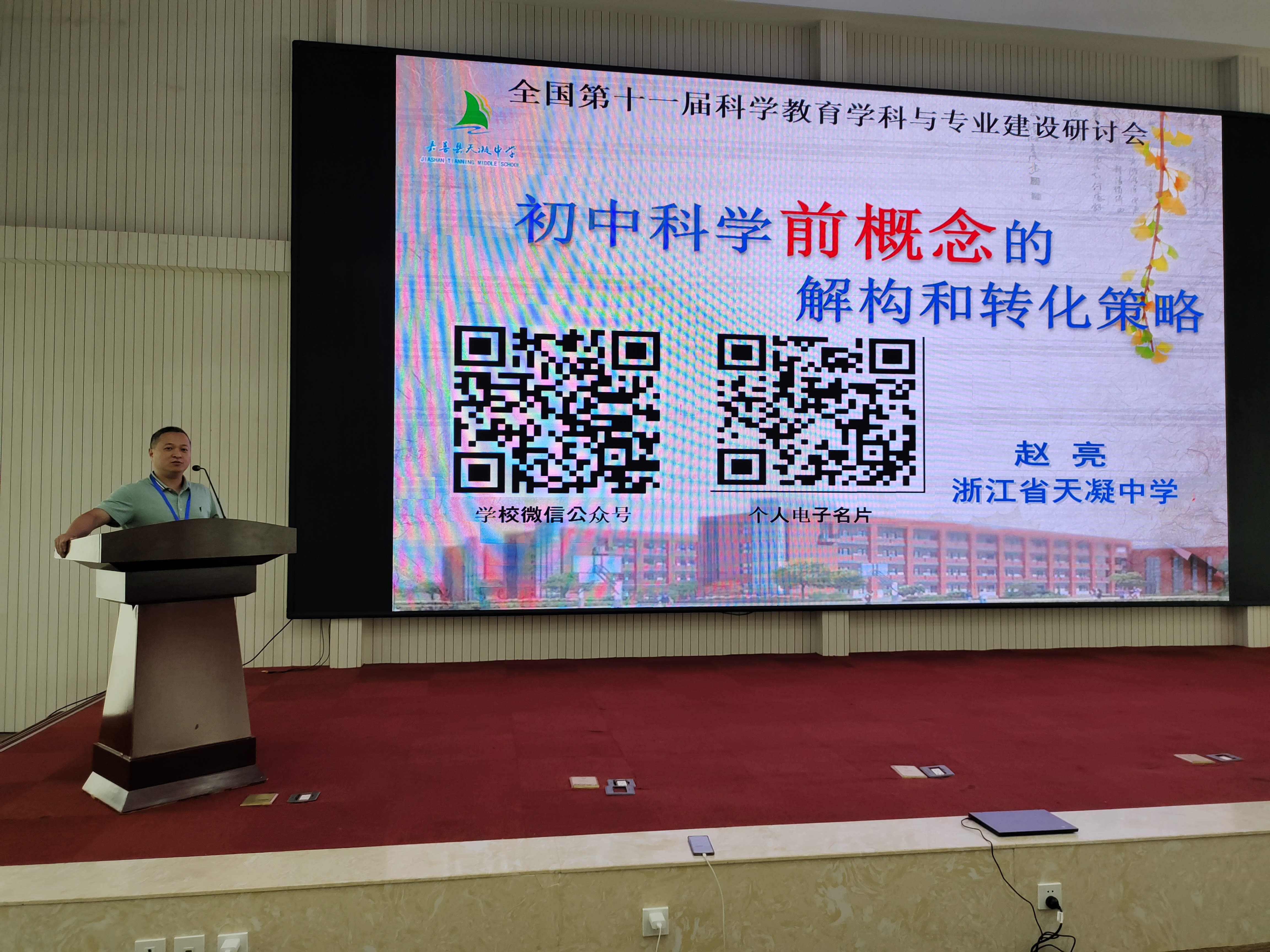 赵亮老师发言的主题是《初中科学前概念的解构和转化策略》,他和大家分享了自己实践所得的六大策略,即引发认知冲突,破顽固前概念;强概念辨析,破易混概念;理性再分析,破浅表认知;巧设路径,破负迁移;搭建脚手架,破思维断层;补生活局限,破认知缺陷。